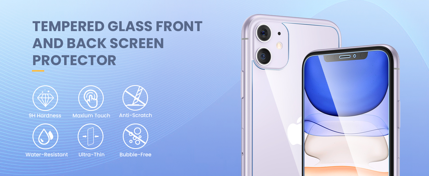 Tempered Glass Screen Protector: iPhone 11 front and back screen protector with high quality hydrophobic oleophobic coating make your phone has nice touch accurate and against fingerprints, water, oil, smudges.