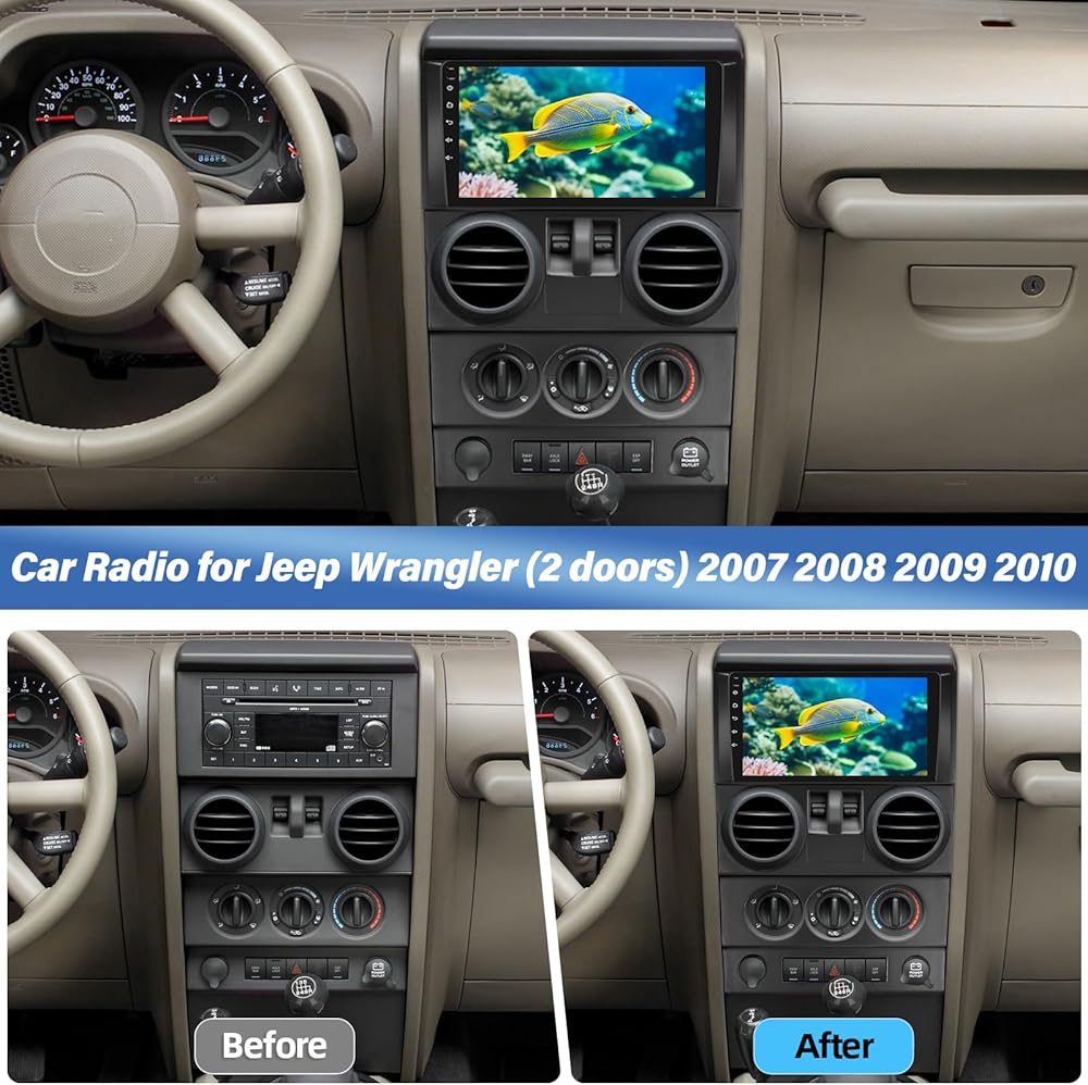 Applicable Models: This car radio is suitable for Jeep Wrangler 2007 2008 2009 2010 (4 Door), please compare your car center console and adapter interface before purchasing. Android 13 Car Stereo, 2G RAM 64G ROM. The main unit supports Bluetooth, EQ DSP, WiFi, GPS, FM, Mirror Link, Rear Camera Input and External Microphone to meet your various needs.