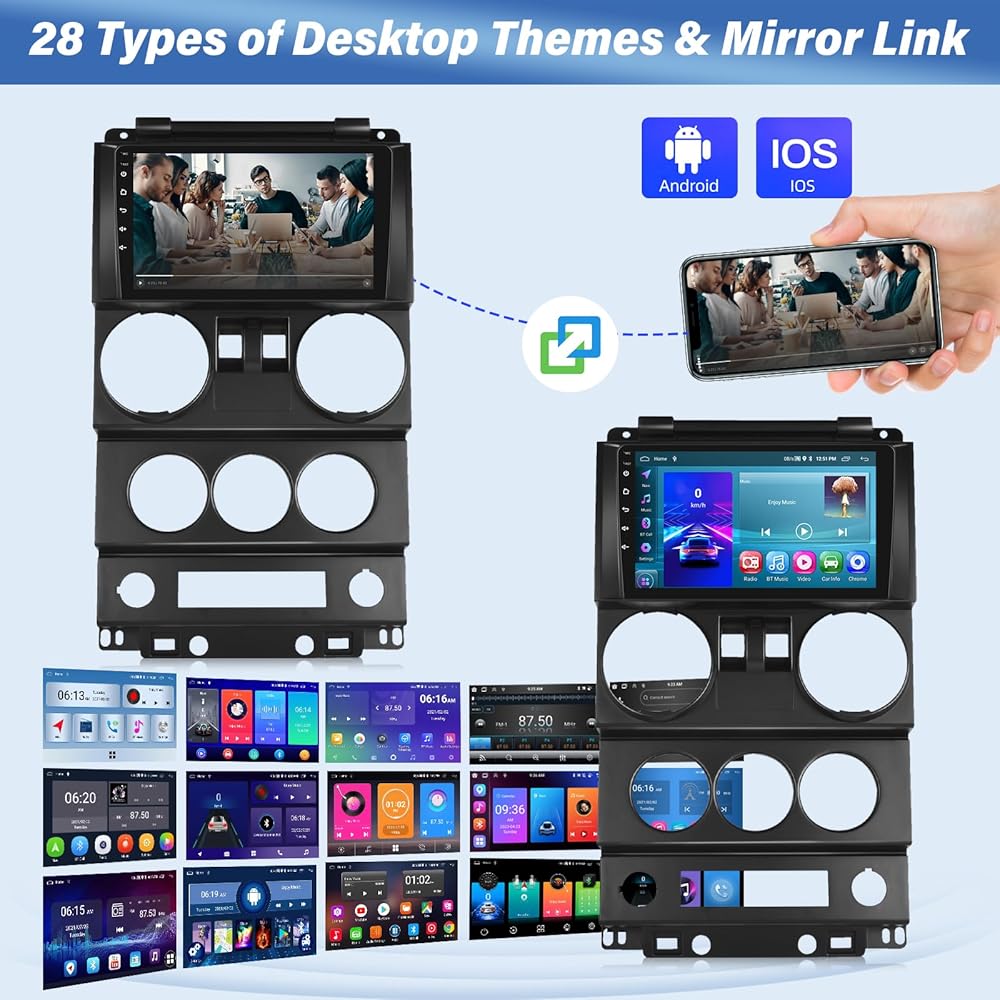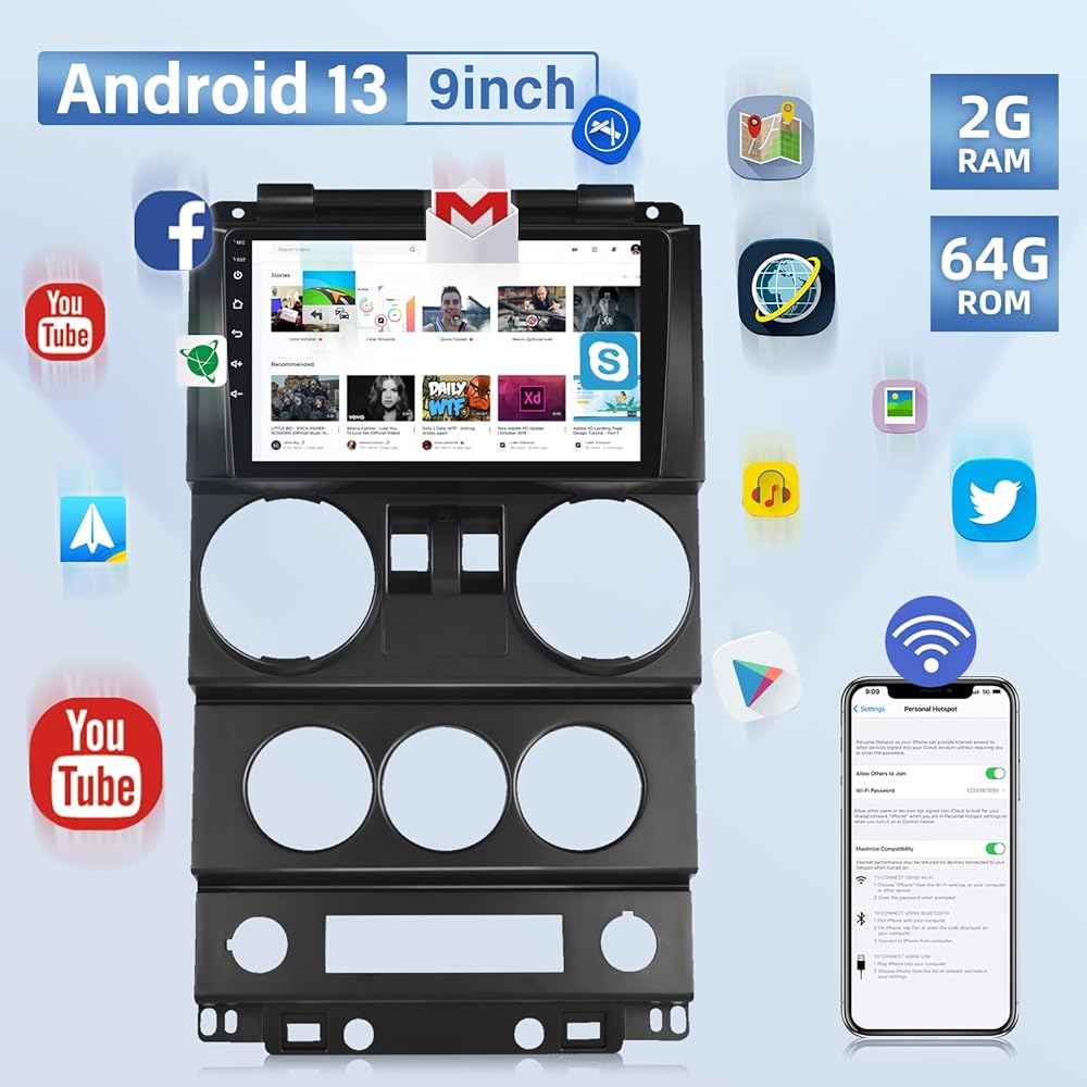 Built-in Wireless Carplay and Android Auto: Replacement radio for Jeep Wrangler with HD touchscreen. The android radio built-in wireless/wired Apple CarPlay and wireless/wired Android Auto for superior voice-assisted controls and easier access to your phone's features, including music, navigation, calls, notifications, messages and more.
