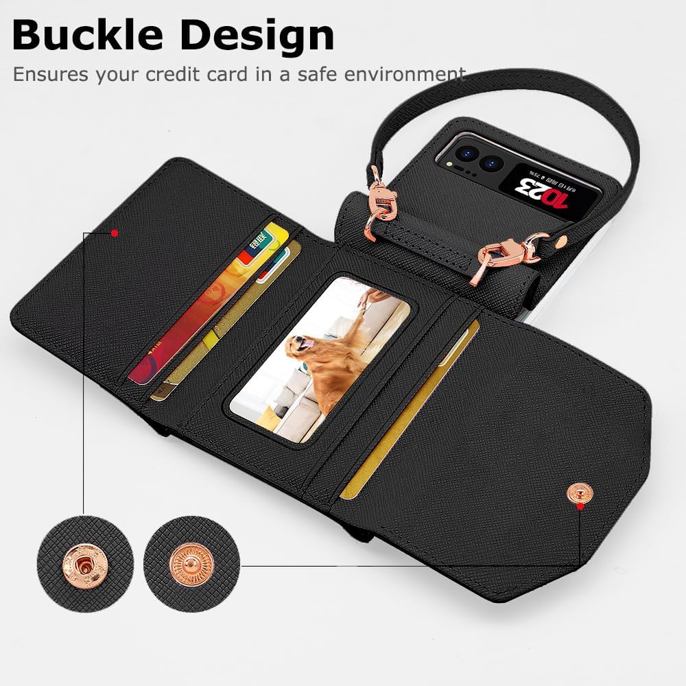 【Large Capacity Card Holder & Metal Buckle】 The Motorola Razr 2023 wallet case come with 4 Card Holders + 1 cash slot, which allows you storage for ID cards, debit cards, credit cards etc, making your everyday outings lighter and more convenient. No need to carry a heavy wallet when going out. Metal Buckle, ensures these cards in a safe environment.