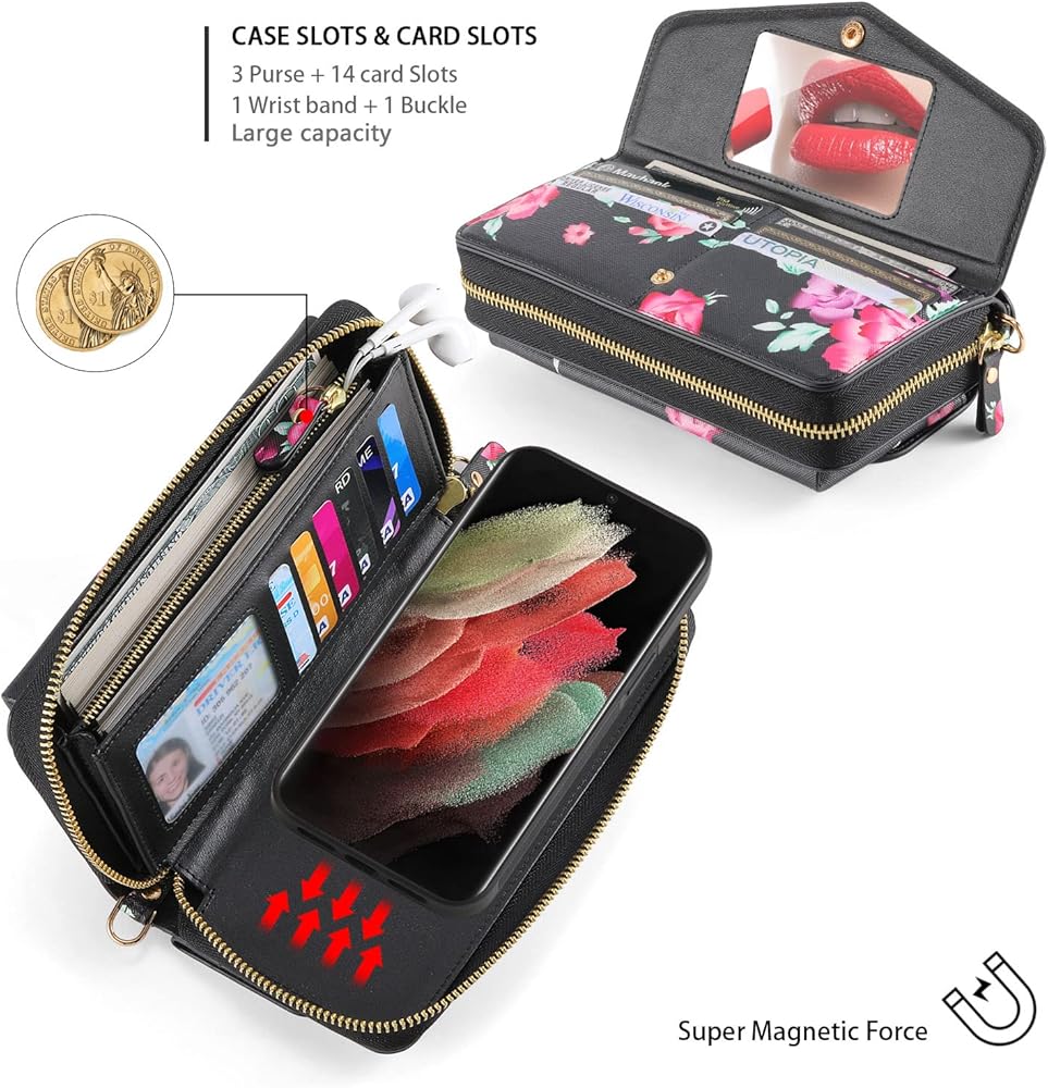 Compatible with Samsung Galaxy S23 Ultra zipper wallet case with RFID blocking card holders: Wallet Case for women,girls,and Teens of all ages.2 in 1 wallet style design leather case with 12 Card Slots,4 cash slots,1 Zipper Wallet,1 Wrist Strap and 1 Crossbody Chain Strap.to keep your ID card, credit cards, coins ,cash and other things.