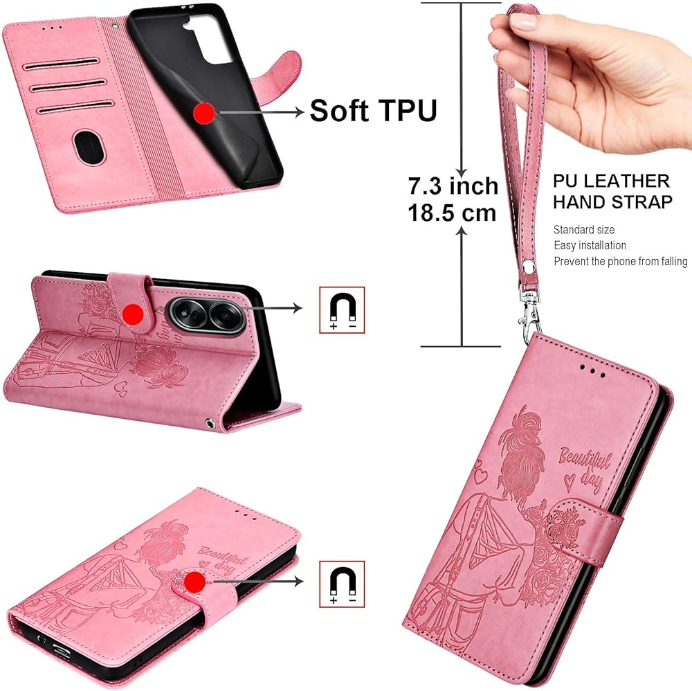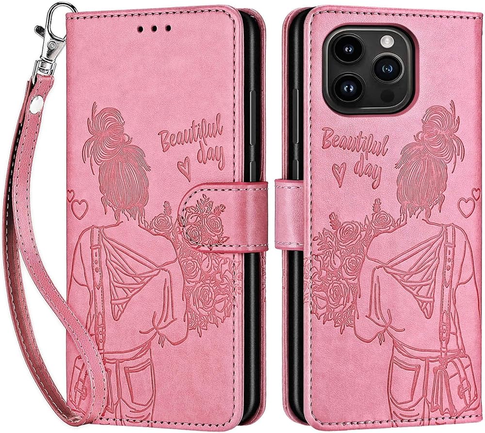 For iPhone 15 Pro Wallet Case , Embossed , Wrist Strap, Stylish Pattern Designed Wallet Case; Please check the phone model carefully before purchasing
