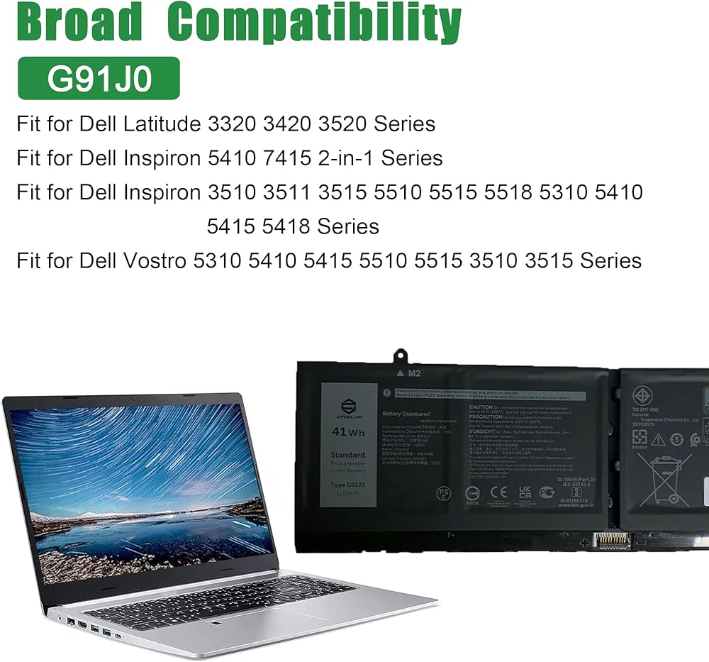 G91J0 Laptop Battery Replacement for Dell Inspiron 3510 3511 3515 5510 5515 5518 5310 5410 5415 5418 Series Notebook 0927N5 0927N5 G91JO Black 11.25V 41Wh 3467mAh