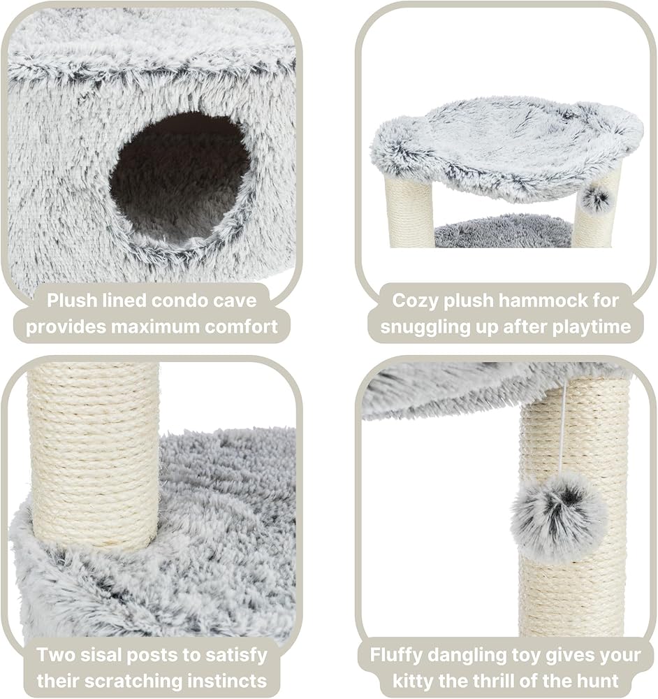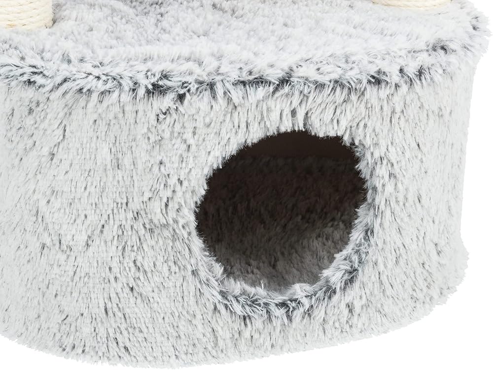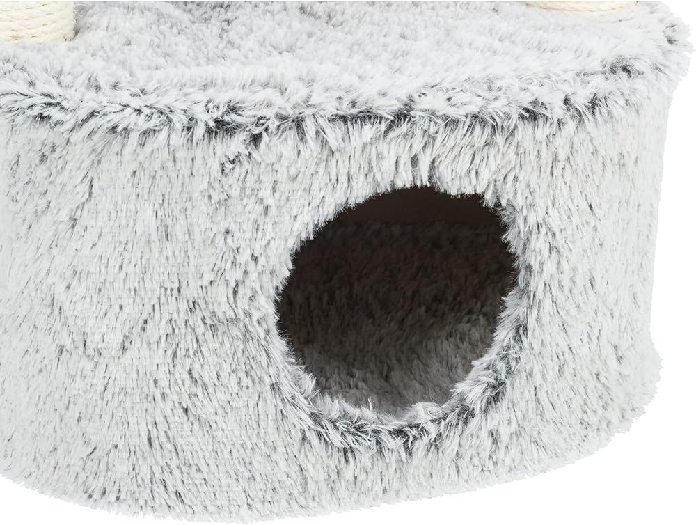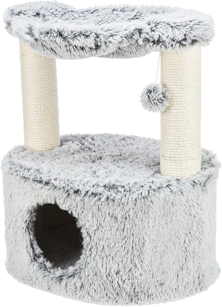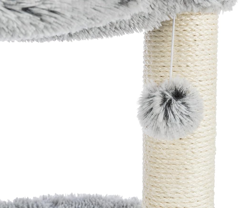 The TRIXIE Gerado Cat Tree with Hammock provides an endless source of fun and comfort. Your little furry friend will spend hours jumping, climbing, scratching, grooming, and napping. Felines can sharpen their claws on durable jute-covered scratching posts instead of on your furniture or carpet, giving them a healthy outlet for their scratching instincts. When they are feeling a little spunky, we've included a dangling pom-pom toy to peak their playful interests. If a nap is in order, they can sink down into the soft hammock or hide out in the cozy condo. Both are covered with long-haired plush material making them the perfect retreat. This cat tree is suitable for cats of all ages and activity levels.