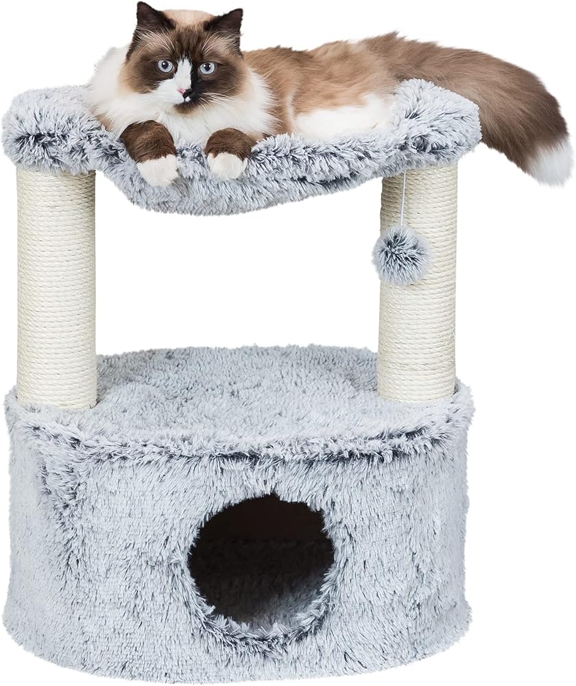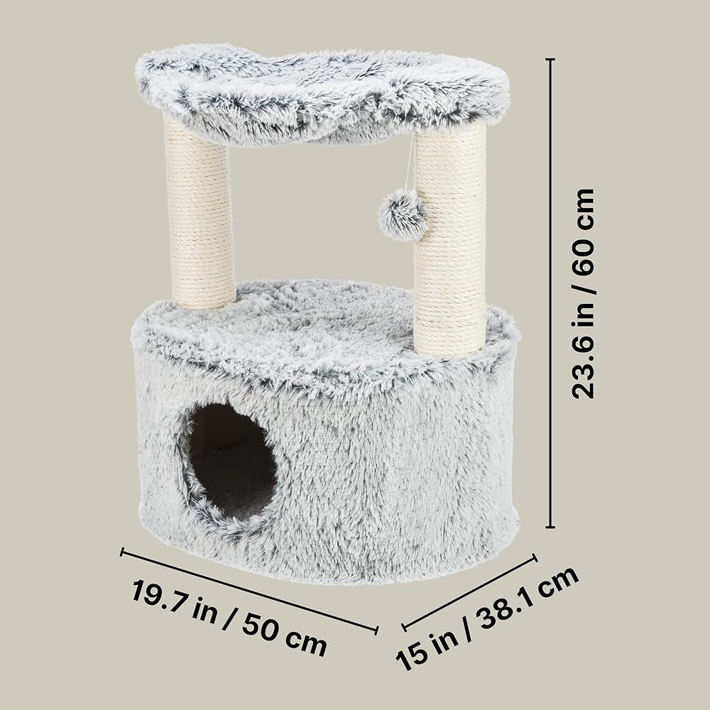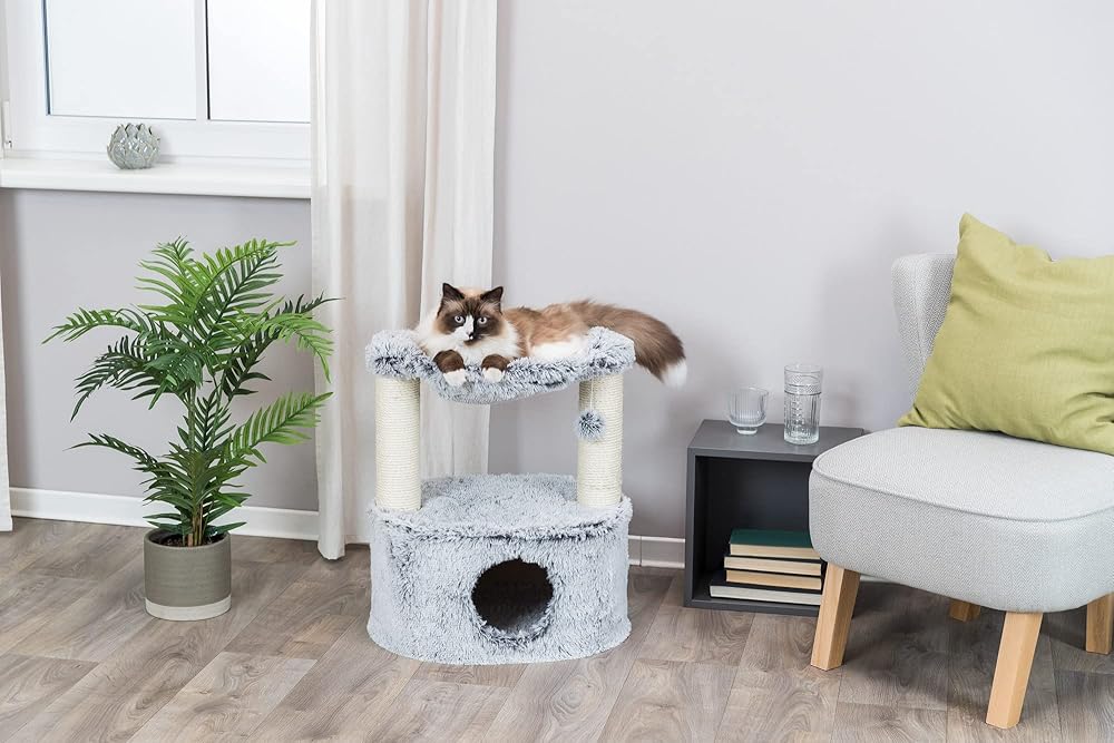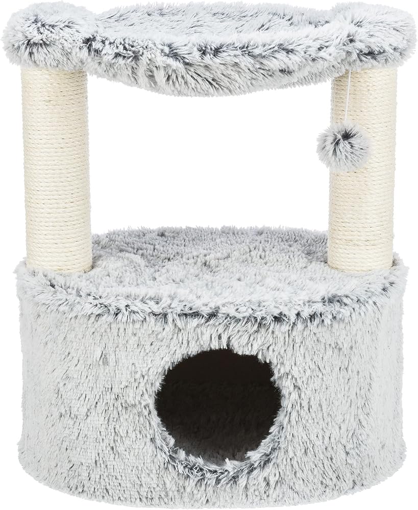 The TRIXIE Gerado Cat Tree with Hammock provides an endless source of fun and comfort. Your little furry friend will spend hours jumping, climbing, scratching, grooming, and napping. Felines can sharpen their claws on durable jute-covered scratching posts instead of on your furniture or carpet, giving them a healthy outlet for their scratching instincts. When they are feeling a little spunky, we've included a dangling pom-pom toy to peak their playful interests. If a nap is in order, they can sink down into the soft hammock or hide out in the cozy condo. Both are covered with long-haired plush material making them the perfect retreat. This cat tree is suitable for cats of all ages and activity levels.