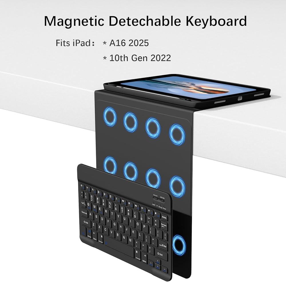 Keyboard Case for iPad 11th Generation (A16) 2025, for iPad 10th Generation 2022 [Magnetic Detachable Wireless Keyboard][Support 3 System] Folio Case with Pencil Holder, Black