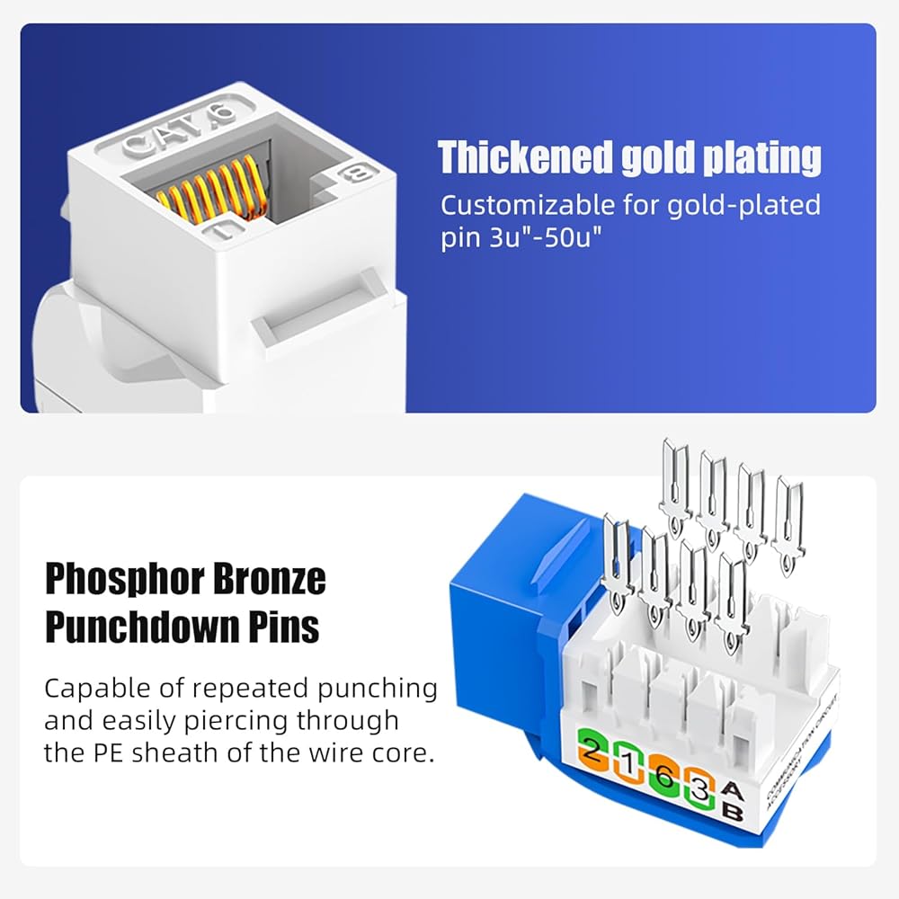 Reliable Quality:Constructed with high-quality PC UL94V-0 material for durability;thickned gold plating customizable for gold-plated pin 3u"-50u";phosphor bronze punchdown pins capable of repeated punching and easily piercing through the PE sheath of the wire core,Ensure signal transmission stability