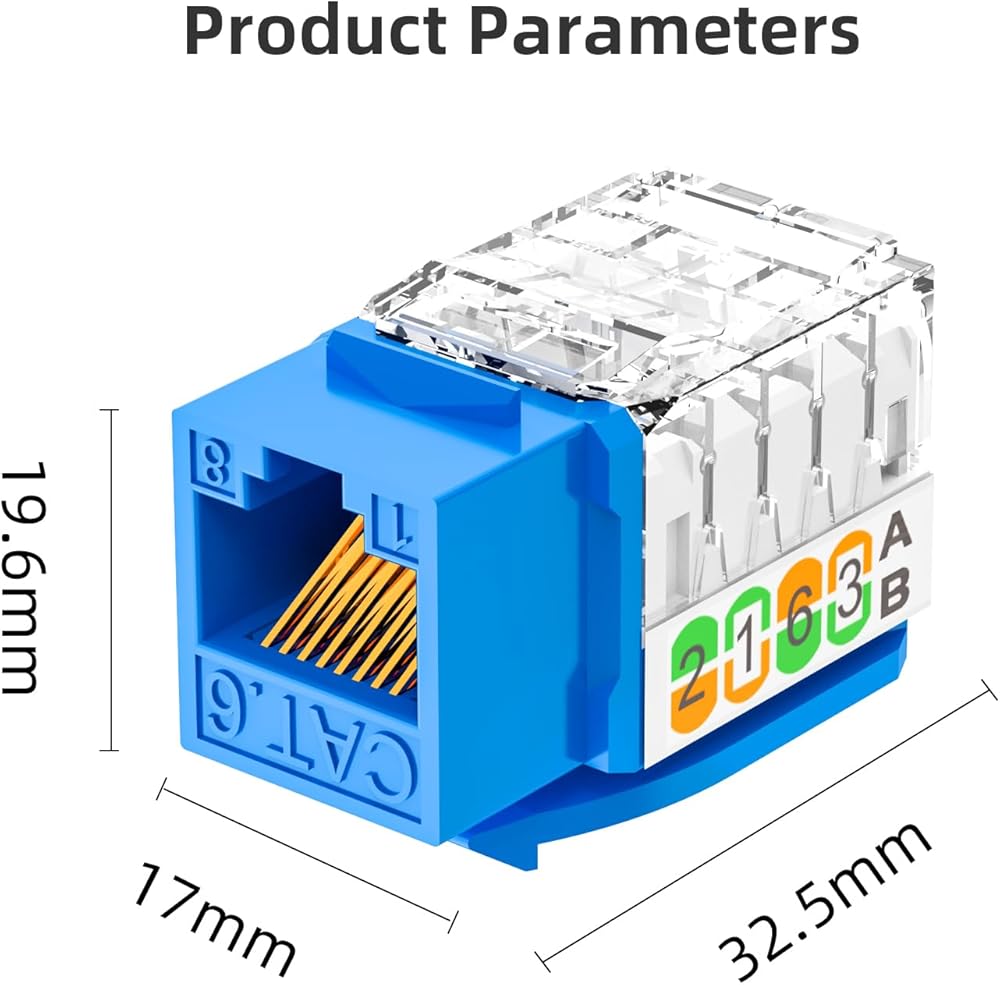 Good Performance:The Cat6 Keystone Jacks are backward compatible with 10/100/1000 Mbps Ethernet CAT5, CAT5E, and CAT6; support multi-strand UTP network cables (22-26AWG); have T568A and T568B wiring schemes marked next to the clips; and comply with the standard ANSI/TIA/EIA 568-C.2, ensuring excellent performance