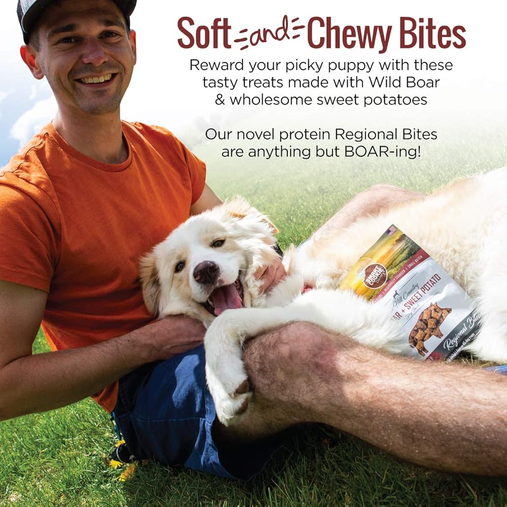 HELP YOUR DOG FEEL THEIR BEST: Made with limited ingredients you can actually pronounce and see, our wholesome, chewy, bite-sized training treats are great for all dogs; Novel proteins make our Regional Bites anything but BOAR-ing!