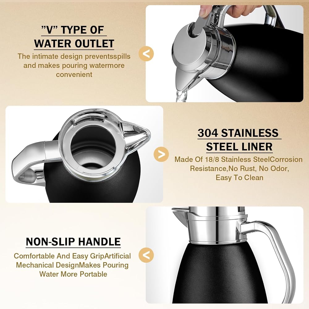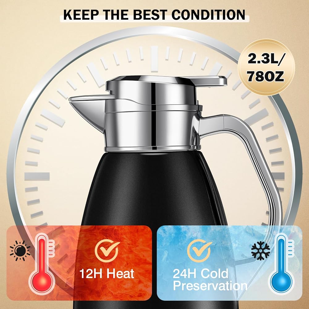Large Capacity: the insulted carafe has about 78 oz capacity, which can hold approximately more than 12 drinks or coffees, the proper size is suitable for both home use and travel use, providing you with a nice using experience