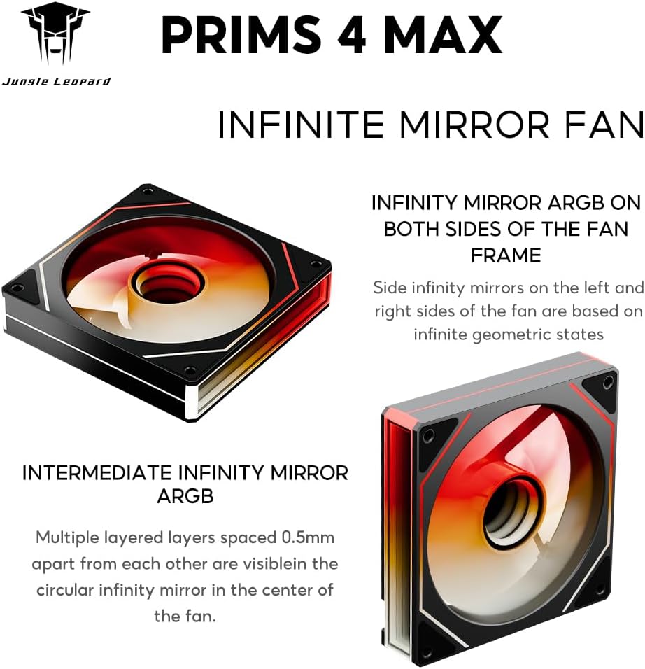 Three sided Infinite Mirror ARGB light effect:Jungle Leopard ICOLER Prism 4 MAX 120mm ARGB PC fan The side infinity mirrors on the left and right sides of the fan are based on infinite geometry. Multiple layers 0.5mm apart are visible in the circular infinity mirror at the center of the fan