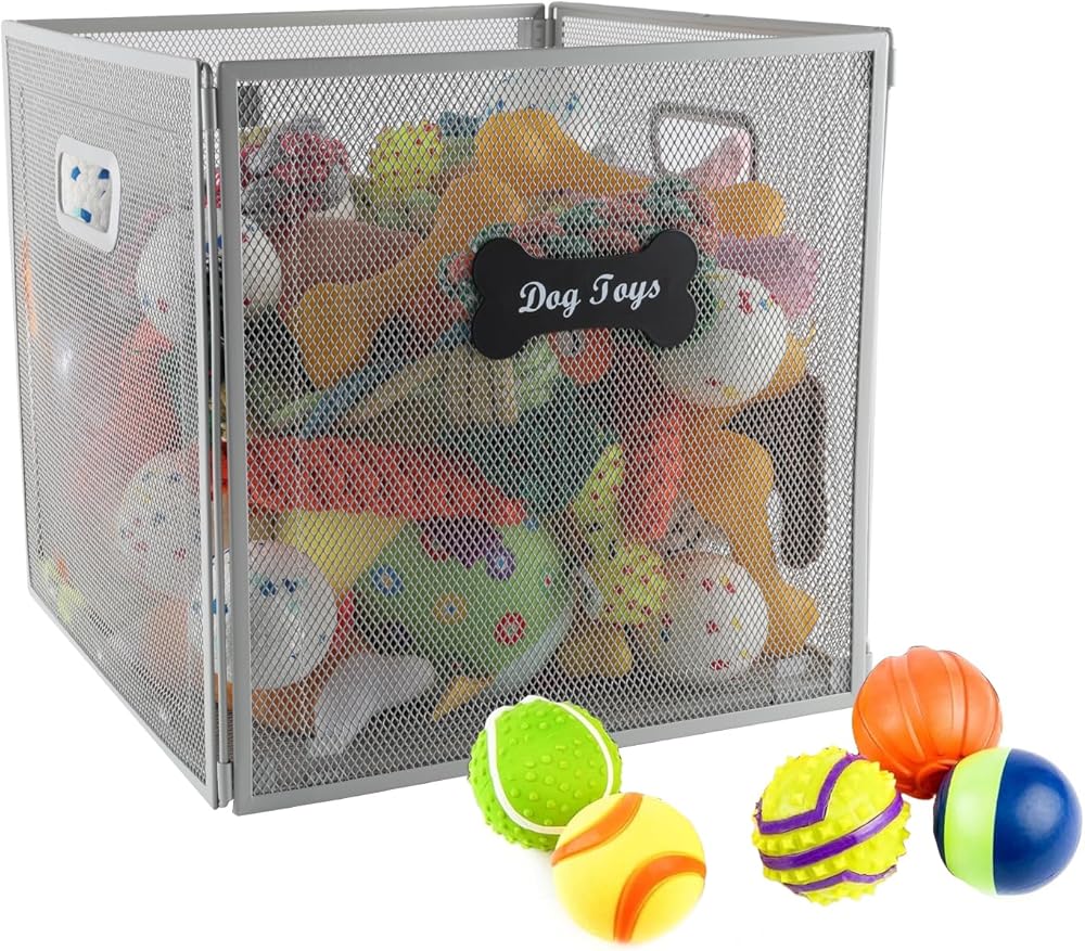 Introducing the large dog toy storage bin set of 2,the ultimate solution for organizing your pet's toys, food, and accessories. Large size 15.1"L x 10.7"W x 7"H, Medium-sized14"L x 9.4"W x 6.6"H,this spacious and durable Dog Toy Basket is designed to keep your home tidy and your pet's essentials easily accessible. Crafted from high-quality metal, it features a robust construction that can withstand daily use while adding a stylish touch to any room. The versatile design of this dog toy bin makes it perfect for holding a variety of items, from dog toys and treats to cat accessories and pet food. The large capacity ensures ample space for all your pet's belongings, and the personalized option allows you to add a unique touch to the bin, making it a charming addition to your home decor. Equipped with a sturdy wooden handle, this metal basket for Pet is easy to carry and move around, whether you're organizing your living room, kitchen, or outdoor space. Its sleek metal construction not only provides strength but also enhances the aesthetic appeal of your home. Ideal for pet lovers who value both functionality and style, this dog toy large dog toy basket is a must-have for maintaining an organized and clean environment for your furry friends.