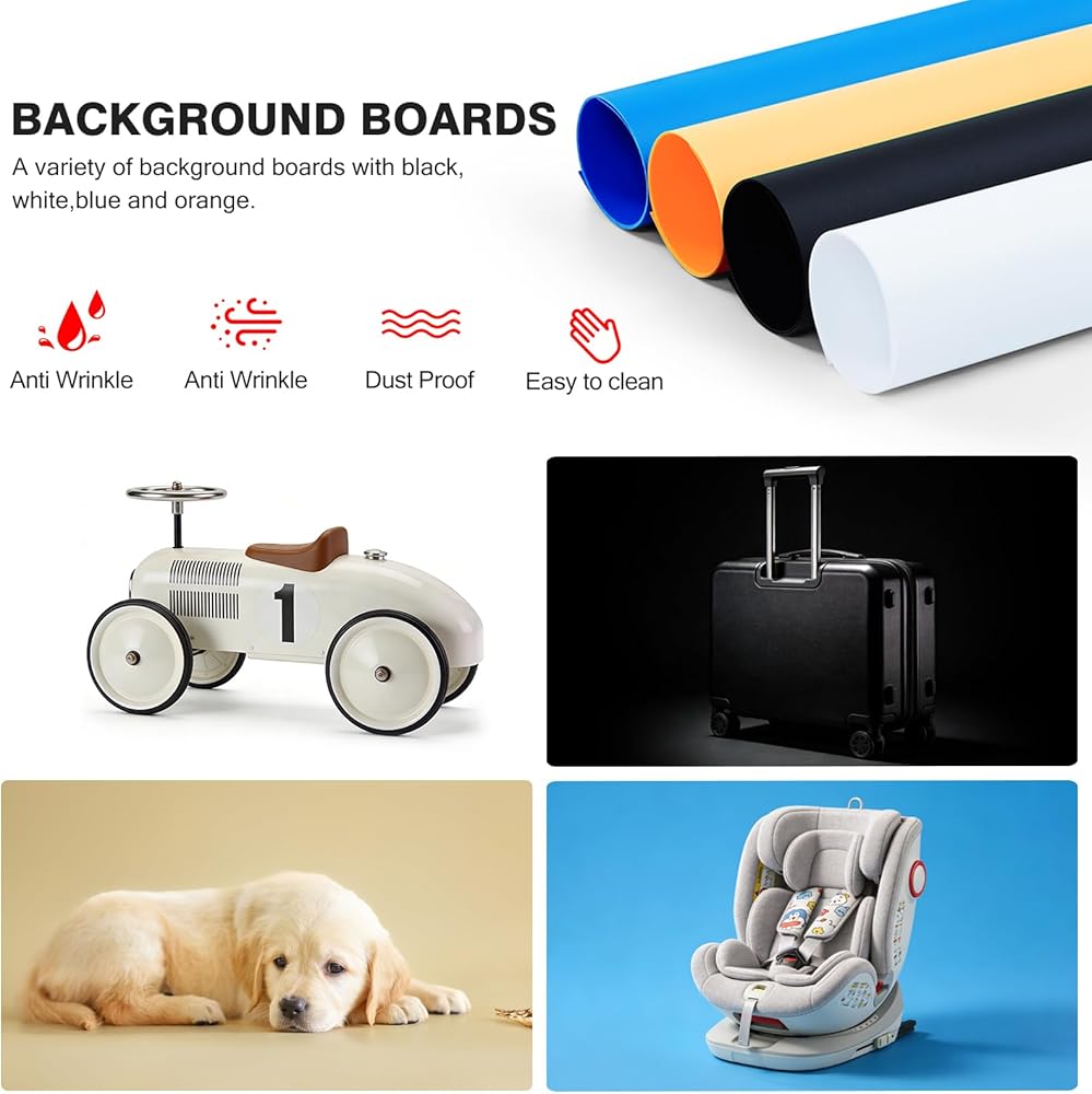 [Six Double-Sided Backgrounds for Variety in Every Shot] The lightbox includes six double-sided, thick PVC backgrounds in colors such as white, black, red, blue, orange, and green, allowing for seamless scene changes. Use the classic white background for photography that requires a minimalist, distraction-free setting, or choose other colors to add vibrancy and contrast, enhancing your photo's appeal.