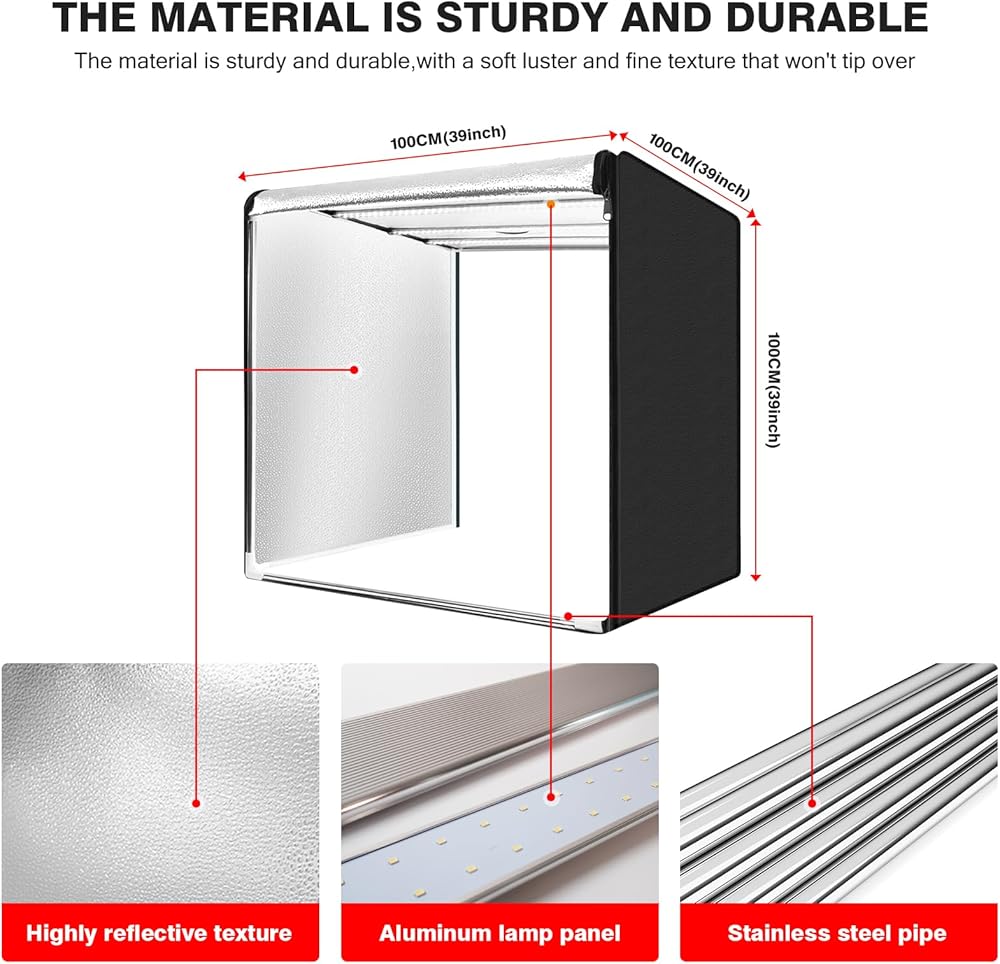 [Enhanced Detail with Diffuser and Reflector Panels] To help achieve the best lighting conditions, this product photography light box comes with a light diffuser and reflector panels, reducing glare and softening light to eliminate harsh shadows on reflective items. This feature makes it an ideal choice for high-detail shots and close-up product photography, ensuring your images capture every subtle texture and contour.