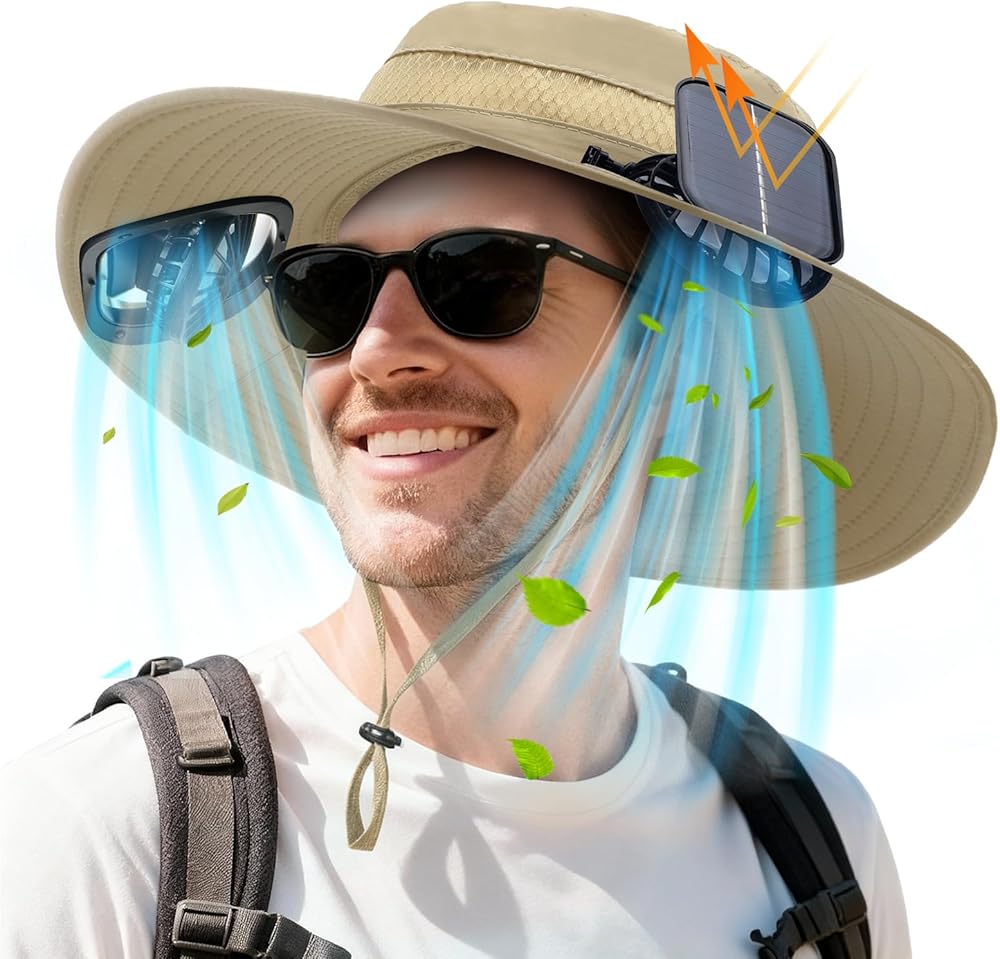 Considerate Design: the fan of the solar hat is designed with 3 PVC soft fan blades and fan protection cover, with large air volume, which can ensure your safety and adjust the wind direction freely, so that you can also maintain cool in summer; Please be careful not to touch the fan with your hands when running