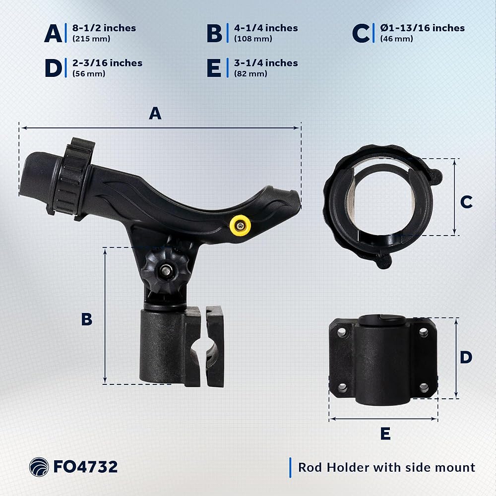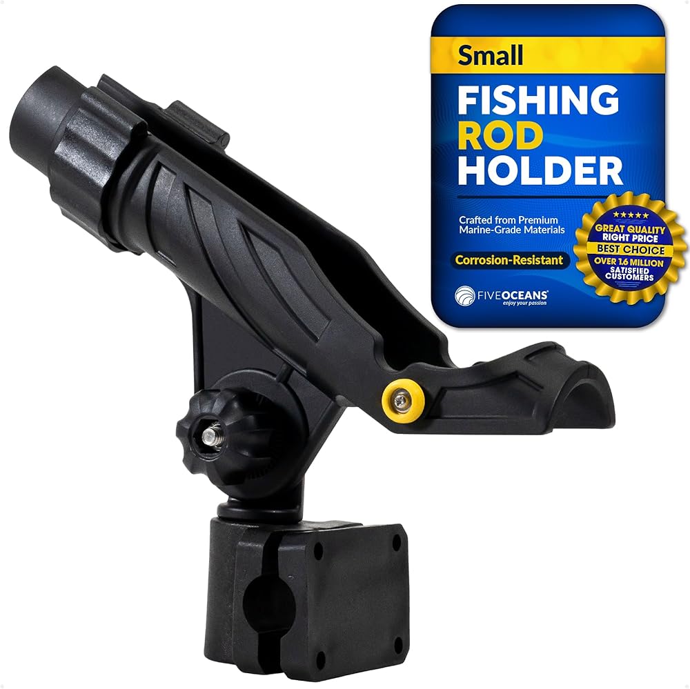Fishing Rod Holder with Rail-Mount Base: The Five Oceans rod holder is one of the must-have boat fishing accessories for anglers, accommodating spinning, baitcaster, and fly fishing reels with ease. Rail Mount: Featuring a locking, 12-point rail mount, this pole holder can be easily installed on your boat rail. The rail-mounted rod holder is easily removable from the included base when not in use. Heavy-Duty Fishing Rod Holder - Crafted from marine-grade UV stabilized fiberglass-reinforced plastic, this rod holder for boats is built to last many fishing seasons with low care and maintenance. Adjustable Boat Rod Holders - Enjoy effortless 0-90-degree elevation adjustments and 360-degree rotation with locking positions every 30 degrees, allowing you to customize your boat fishing setup for maximum comfort and convenience. Secure Rod Holder - The Boat rod holder securely holds spinning reels in a natural downward position, while a rotating, locking collar secures the fishing rod in place and prevents loss from fish strike or traveling. PRODUCT NUMBER : 4732