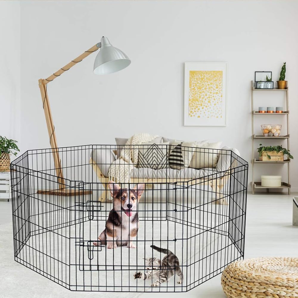 【SAFE & FOLDABLE PET PLAYPEN】:Exercise dog pen has 8 connected panels (each panel 24H Inches) easy to set up puppy pet folding playpen and take it down,folds flat for easy storage and transport.