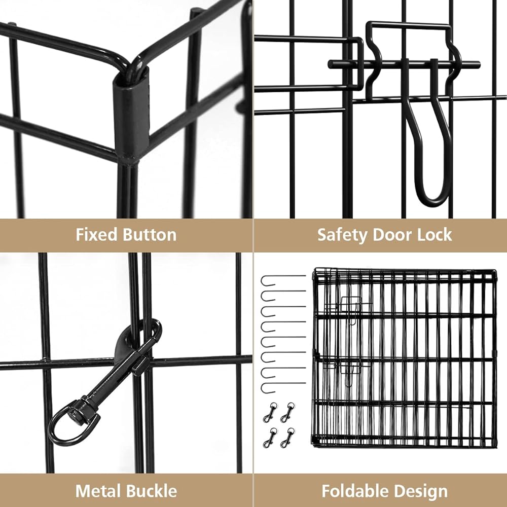【MULTIFUNCTION OF THE DOG FENCE】 : Puppy playpen includes flexible clasps*4,thick stakes*8 can be used in conjunction a metal dog crate to expand your dog's living area.Features 8 interlocking panels that can be arranged in a variety of configurations.