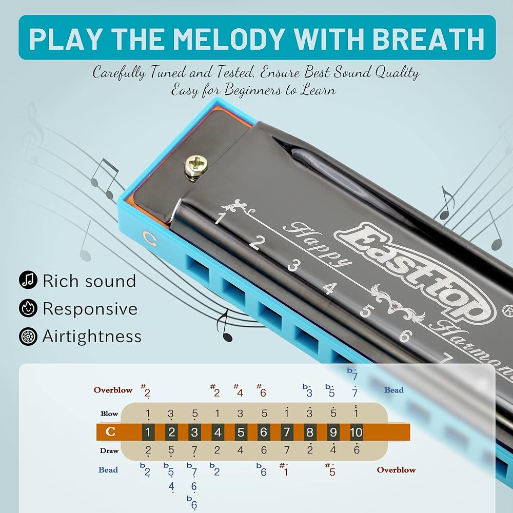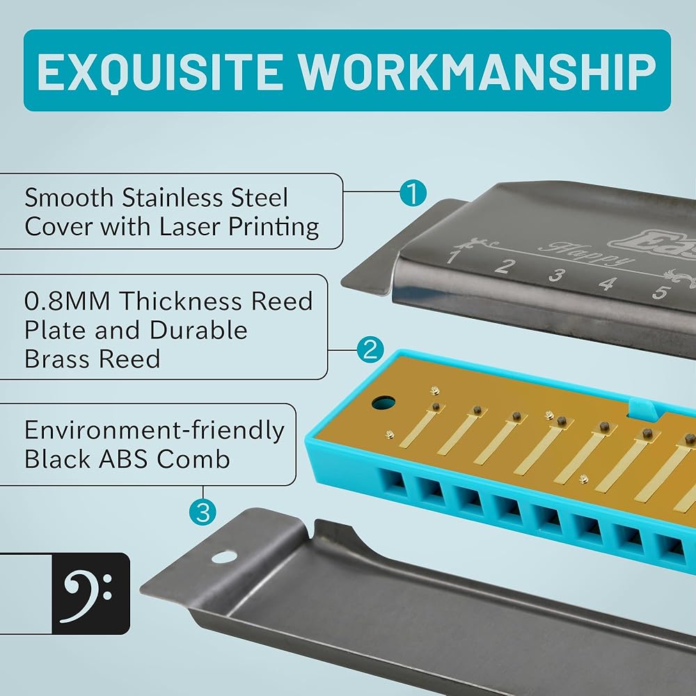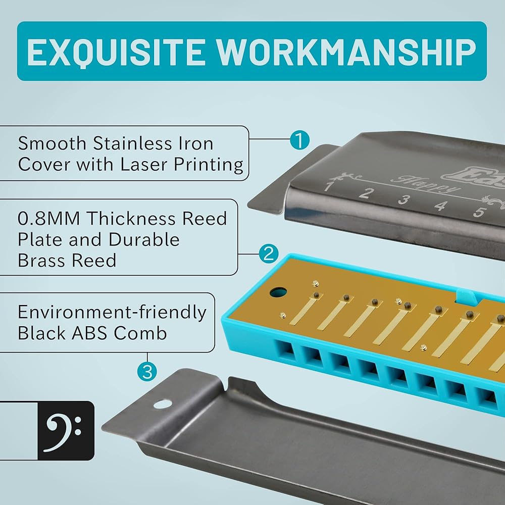 Rich sound, responsive, airtightness - blue plastic comb, stainless steel cover with 0.8mm thickness reed plate,durable brass reed is easier to get the higher pitch, rich sound and timbre.
