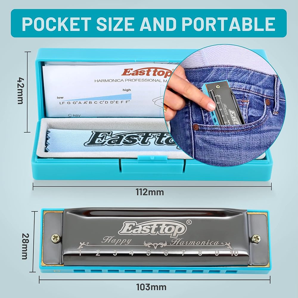 East top Blues Harmonica, Diatonic 10 Holes C Key Happy Harmonica Mouth Organ for Beginner,Kids,Children,Students,Gift,with Carrying Plastic Case,Clean Cloth and Manual