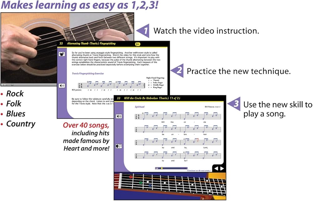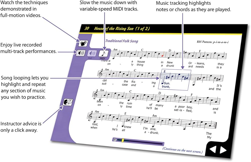 eMedia Guitar For Dummies Level 2 gives you everything you need to continue your journey toward being an accomplished guitarist! It is perfect for anyone who already knows some open chords and is ready for more. Over 90 step-by-step lessons will take you through reading music notation, playing melodies, finger picking and different styles of play including rock, blues, folk and country. New Instant Feedback listens to your playing and highlights notes played correctly in melodies so you can learn faster. Have fun playing along with live recorded songs or MIDI tracks you can slow down or speed up. Your teacher is professional guitarist Kevin Garry, Ph.D., from the University of Colorado at Boulder, who demonstrates techniques in full-motion videos. The excellent teaching he offers will help you become a good guitarist and offers exceptional value.