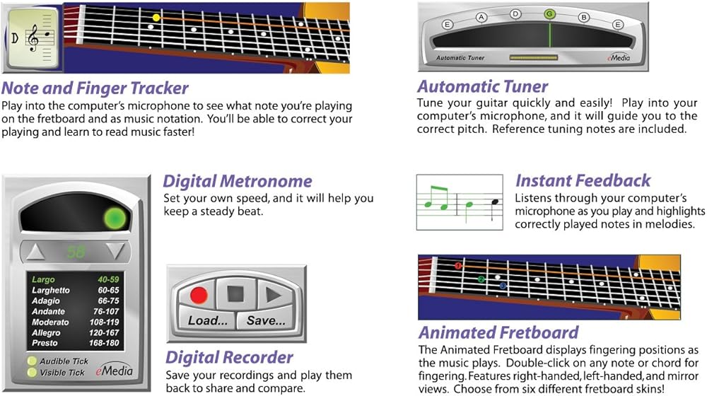 Built-in guitar tools include eMedia's Automatic Guitar Tuner, Guitar Chord Dictionary, Metronome, and Recorder.