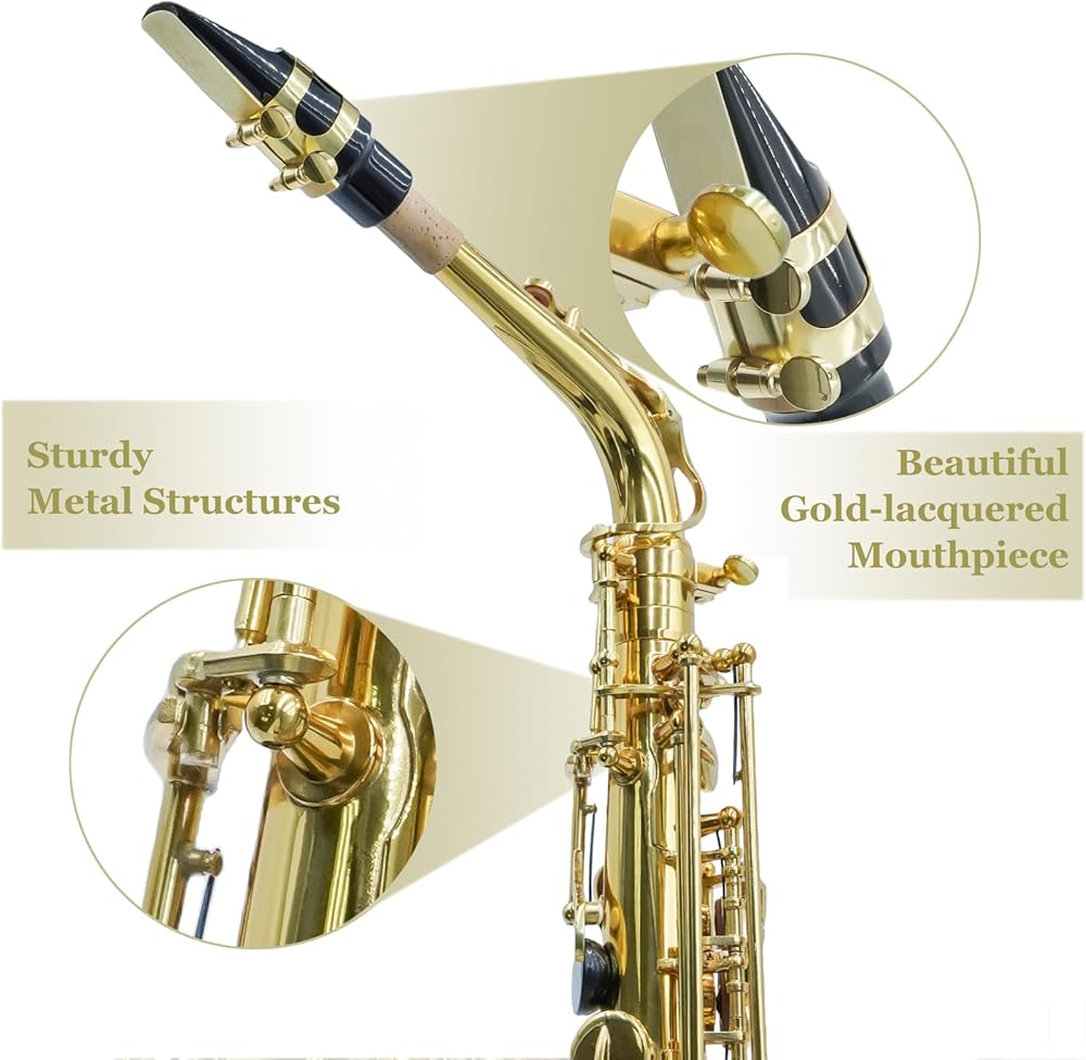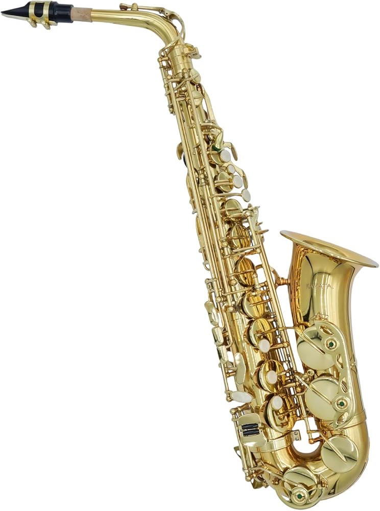 KAYATA alto saxophone is designed to cater to musicians of all ages and skill levels, from beginners to seasoned players, ensuring that everyone can enjoy its versatile performance. Crafted to deliver rich and clear tones, it has been carefully tested by professionals to provide a satisfying sound quality. Available in four elegant finishes—White, Gold, Black, and Antique (Matte Black Nickel)—you can choose the one that best suits your style. The saxophone comes with a comprehensive set of accessories, including gloves, a cleaning cloth, premium cork grease, a canvas case, a shoulder strap, and a flute head, making it a complete package for any player. Additionally, the instrument features a hand-curved logo and intricate design lines, adorned with green gemstone decorations, combining artistic detail with quality craftsmanship.