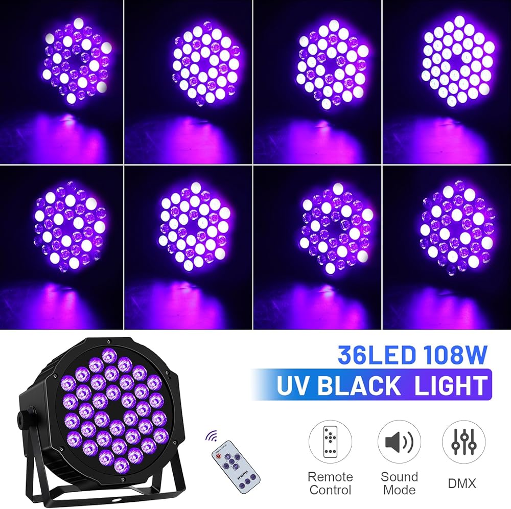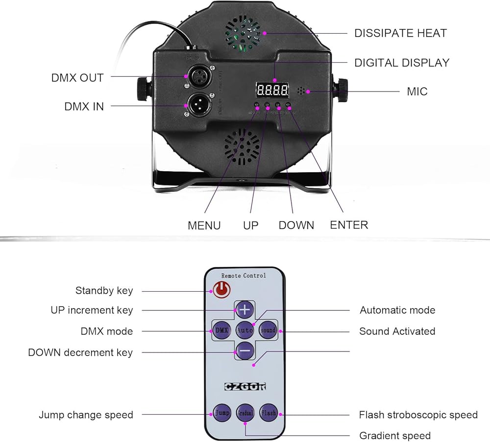 Multiple Lighting Effect:Stage lights for Party. 16- Color / Color Changing/ Auto Mode / Sound Activated Mode / Fade Mode / Flash Mode.Equipped with remote controls, you can easily control the lighting mode and make your party full of magical lights.(Note the stage light is not controlled by the DMX)
