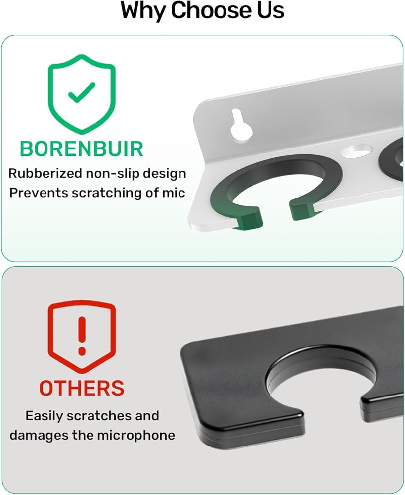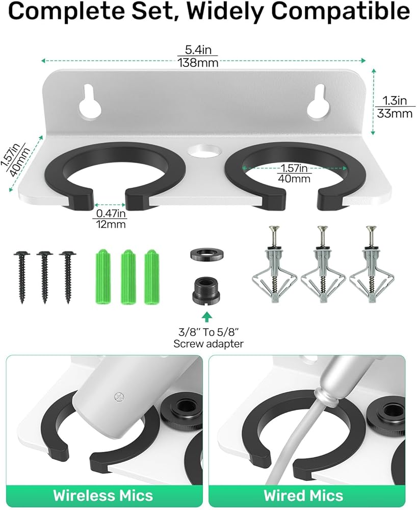 Space-saving Design: Microphone stand has a wall-mounted design that saves space and keeps your work area clear. It has a double stand that allows you to store two microphones at the same time, which is perfect for small recording studios, home offices and KTVs.