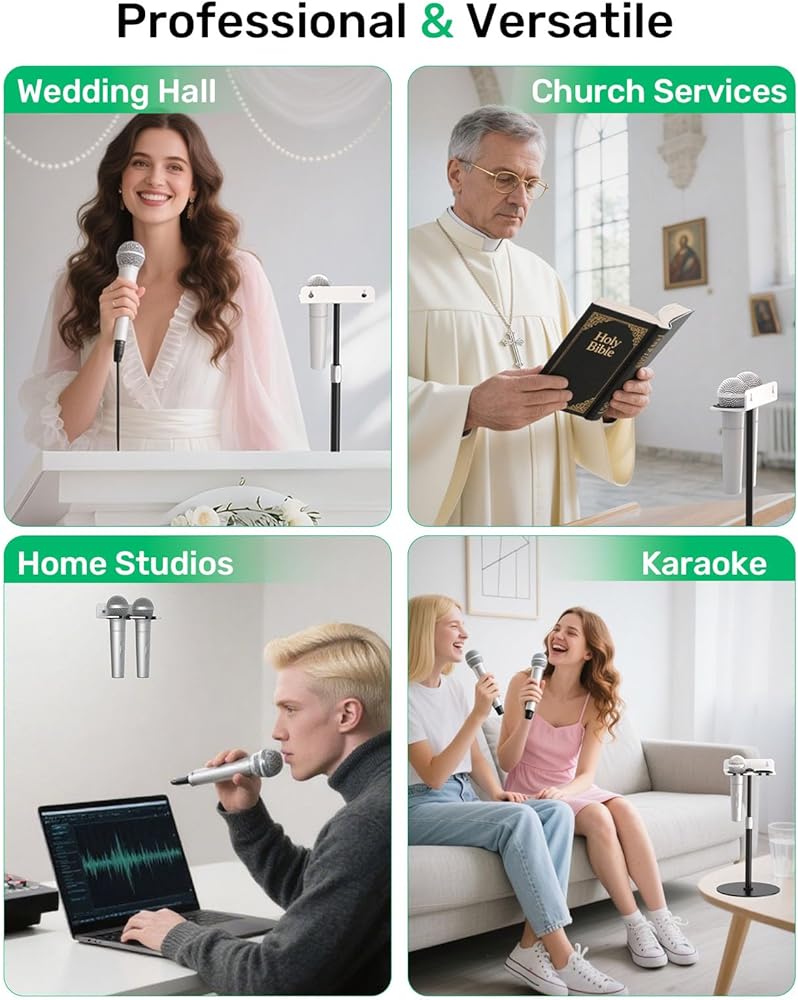 Multi-Mic Holder:This multi microphone holder is the ideal solution for performances, home studios, churches, or professional recording setups. It can securely hold up to two handheld microphones, whether they are dynamic, wired, or wireless, making it perfect for musicians, church services, DJs, and karaoke enthusiasts.