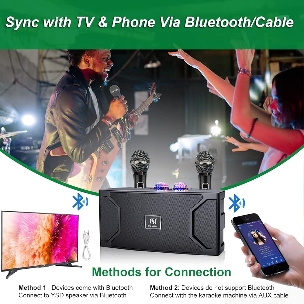 【Bluetooth 5.0 DSP Chip】Portable karaoke machine has built-in Bluetooth 5.0 chip ,provide the more stable transmission and longer distance,ensure the uninterrupted party. Working range of up to 33ft, Compatible with android mobile phone, TV, iPad, tablet, PC. Ideal choose for personal party,school,class room,gym.