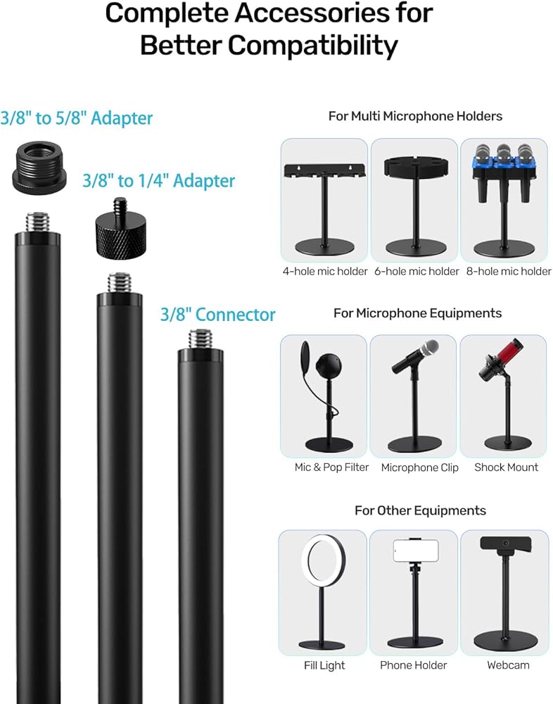 [Easy Installation and Compatibility] Featuring a 5/8"-27 threaded center socket and a 3/8"-16 threaded adapter, this microphone stand is compatible with various standard U.S. and European microphone stands, ensuring quick and easy installation.