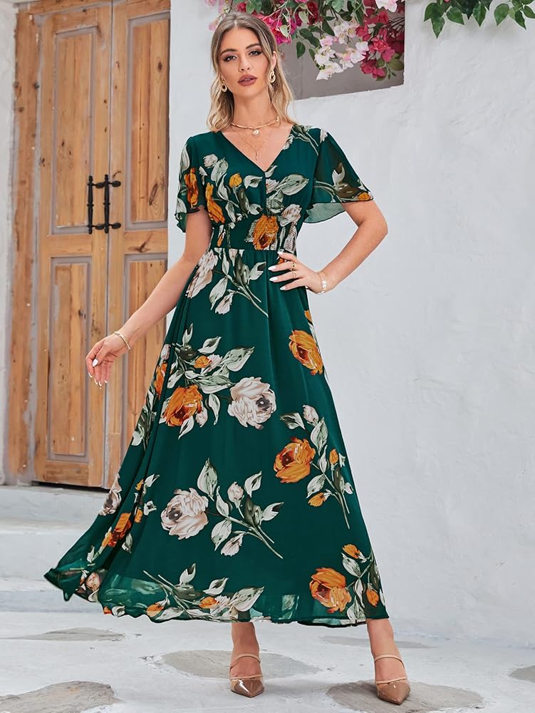 💝【ELEGANT STYLISH】 The Boho floral v neck shows off your beautiful neck and the empire elastic high waist is designed to fit your body better, hides the small belly. A very elegant and beautiful classic A-line Ruffle sleeve smooth maxi dress, boho floral design. The ankle length shows the flowy of the long dress.