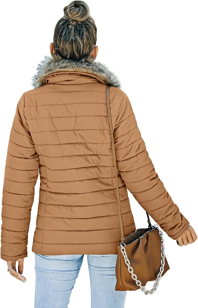 Zip up jackets for women with stand-up collar design, zipper closure, and snap buttons at the neckline. Puffer coat makes you feel warm even in the cold weather. Attached a detachable hood and faux fur trim is not removable.
