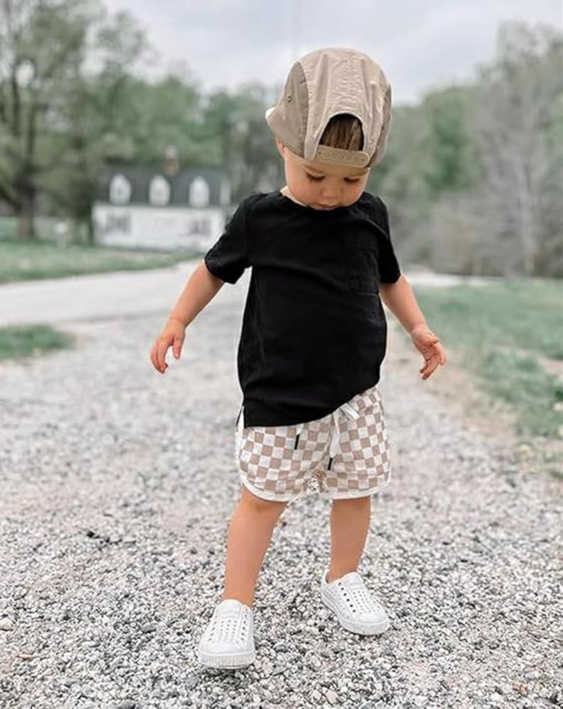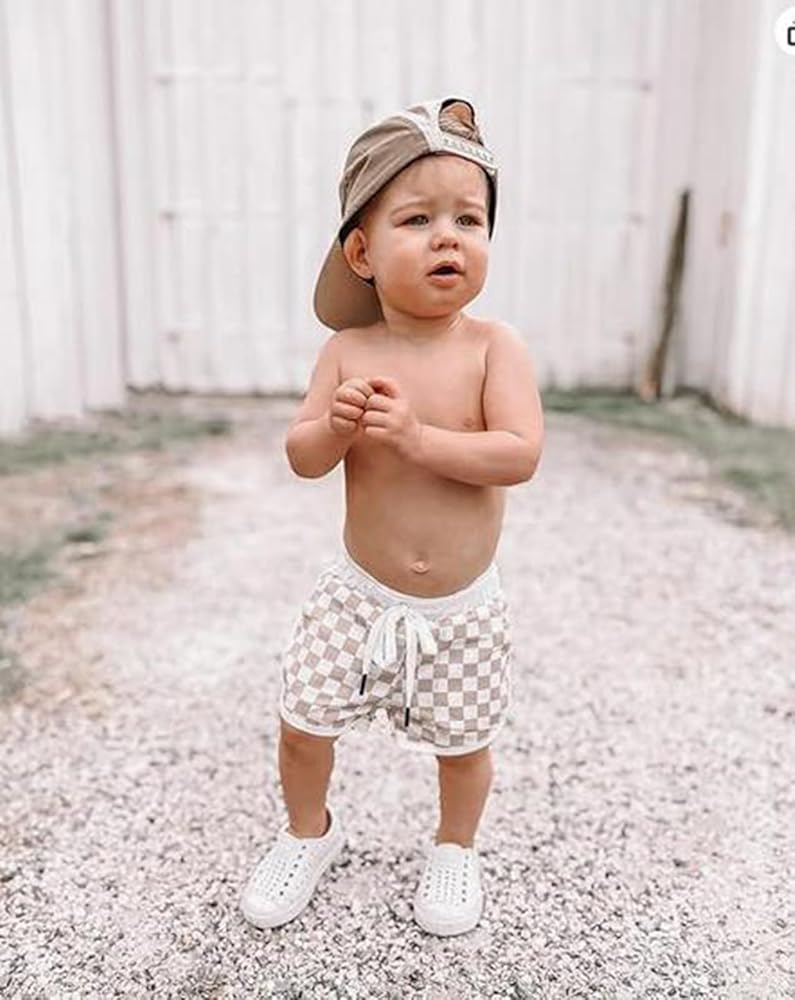 Designs: Baby boy summer shorts, baby boy checkered plaid shorts, toddler boy checkerboard shorts, toddler baby boy checkered jogger shorts, features checkerboard print, drawstring , elastic waist , side pockets, casual style, very fashion and trendy