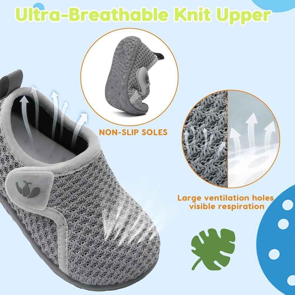 Upper:Knitted Mesh Upper offers comfort and air permeability,has excellent breathability,moisture wicking function,and keep baby's feet dry and odorless.Super Soft,Breathable and Comfortable fit all the year