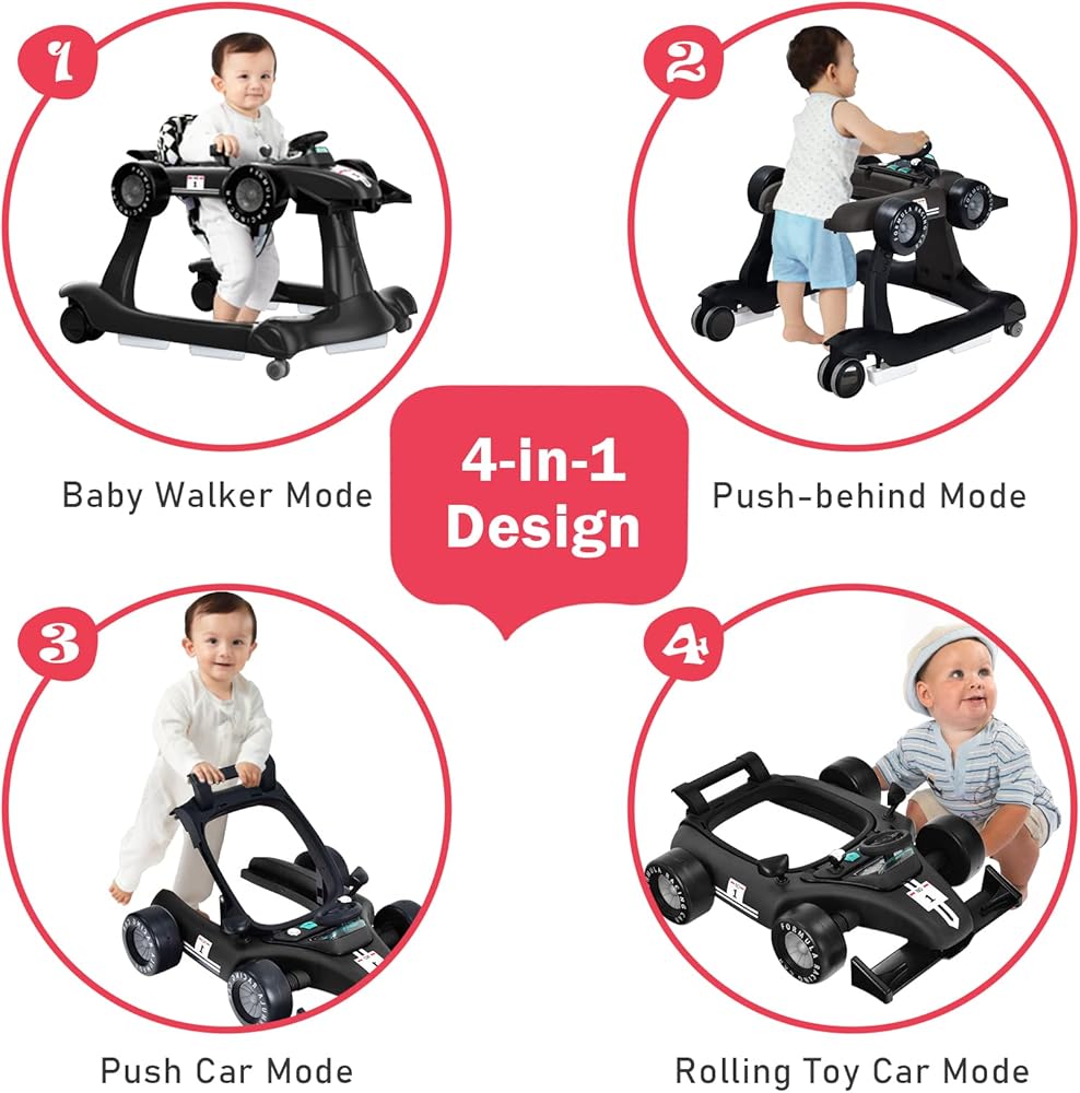 【4-in-1 Multipurpose Baby Walker】 Baby Walker Mode: helps develop balance and sense of direction while encouraging babies to explore and move forward. Walk-behind Toddler Push Walker & Push Car Mode: strengthens leg muscles and promotes independent walking. Toy Car Mode: provides educational and enjoyable early learning. Suitable for baby boys and girls aged 6-18 months.