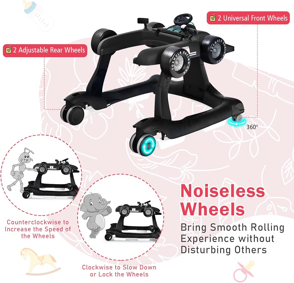 【2-Speed Smooth & Silent Wheels】 The 360° universal front wheels provide flexible and smooth steering to prevent jamming and tipping over. The rear wheels have 2 adjustable speeds to adapt to your baby's walking pace. Additionally, the wheels glide silently without disturbing others and without scratching the floor.
