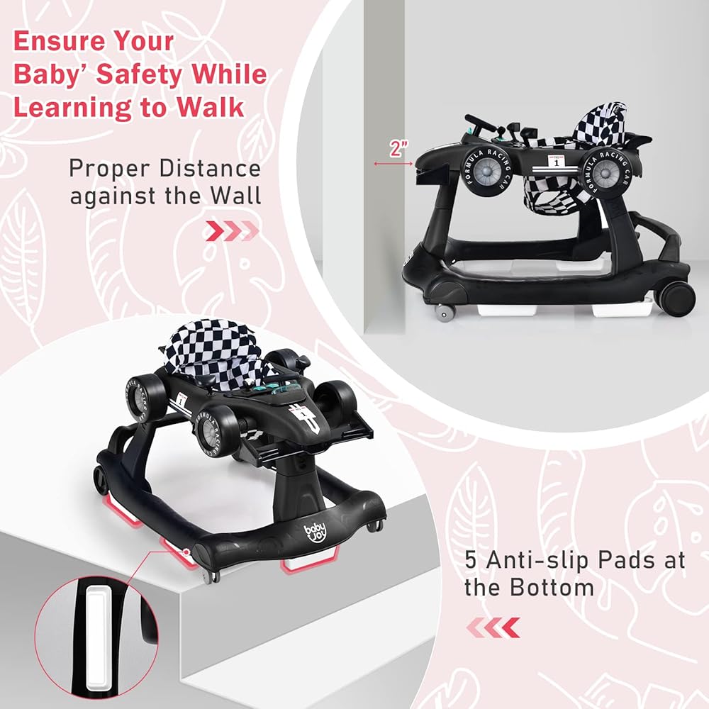 【Safety Comes First】 The ASTM & CPSIA certificated baby walker features 5 anti-slip pads (auxiliary brakes) to eliminate the risk of falling down stairs or rolling down slopes. With a 2-inch gap reserved between the front of the walker and the wall, it prevents finger pinching for a safe world exploration. The enlarged base ensures a stable center of gravity and prevents tipping over. Moreover, the widened wheel spacing prevents foot bumping during walking process.
