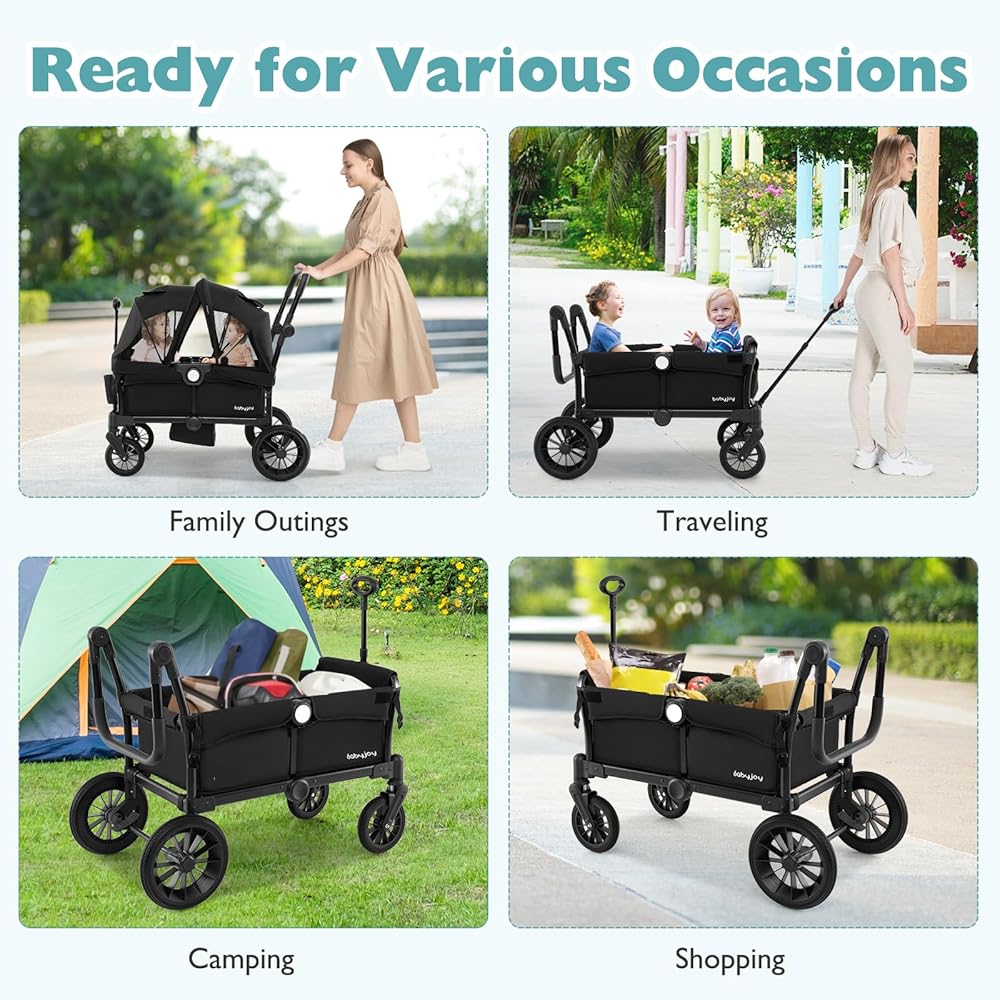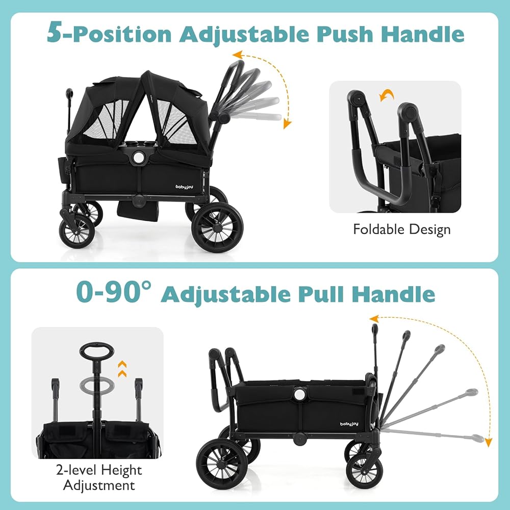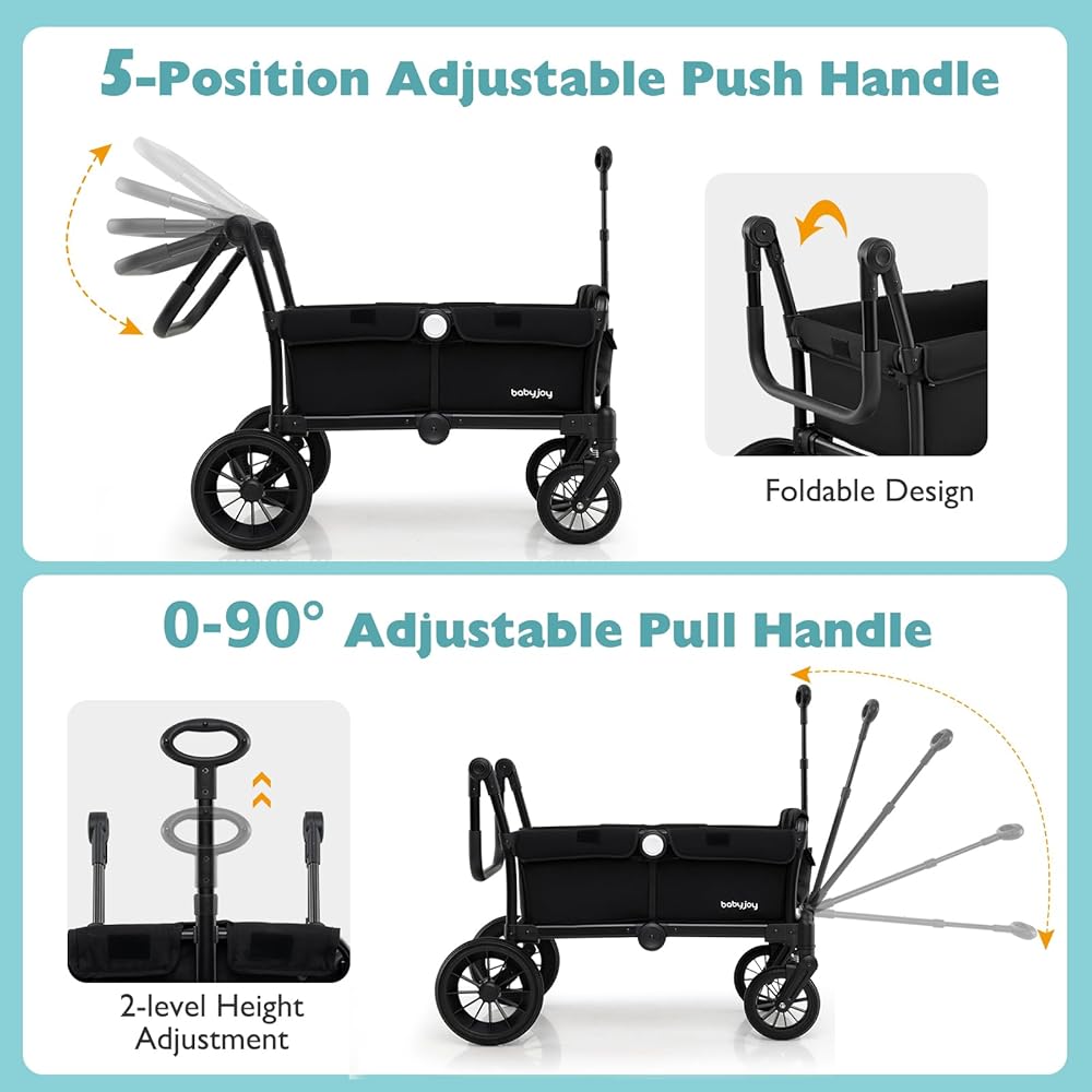 Easy for You to Push or Pull: This wagon stroller is designed with a 5-position adjustable push handle for easy pushing, which can be folded down when not in use. Alternatively, the 0-90° adjustable pull handle with 2 available heights allows you to pull the stroller wagon with ease.