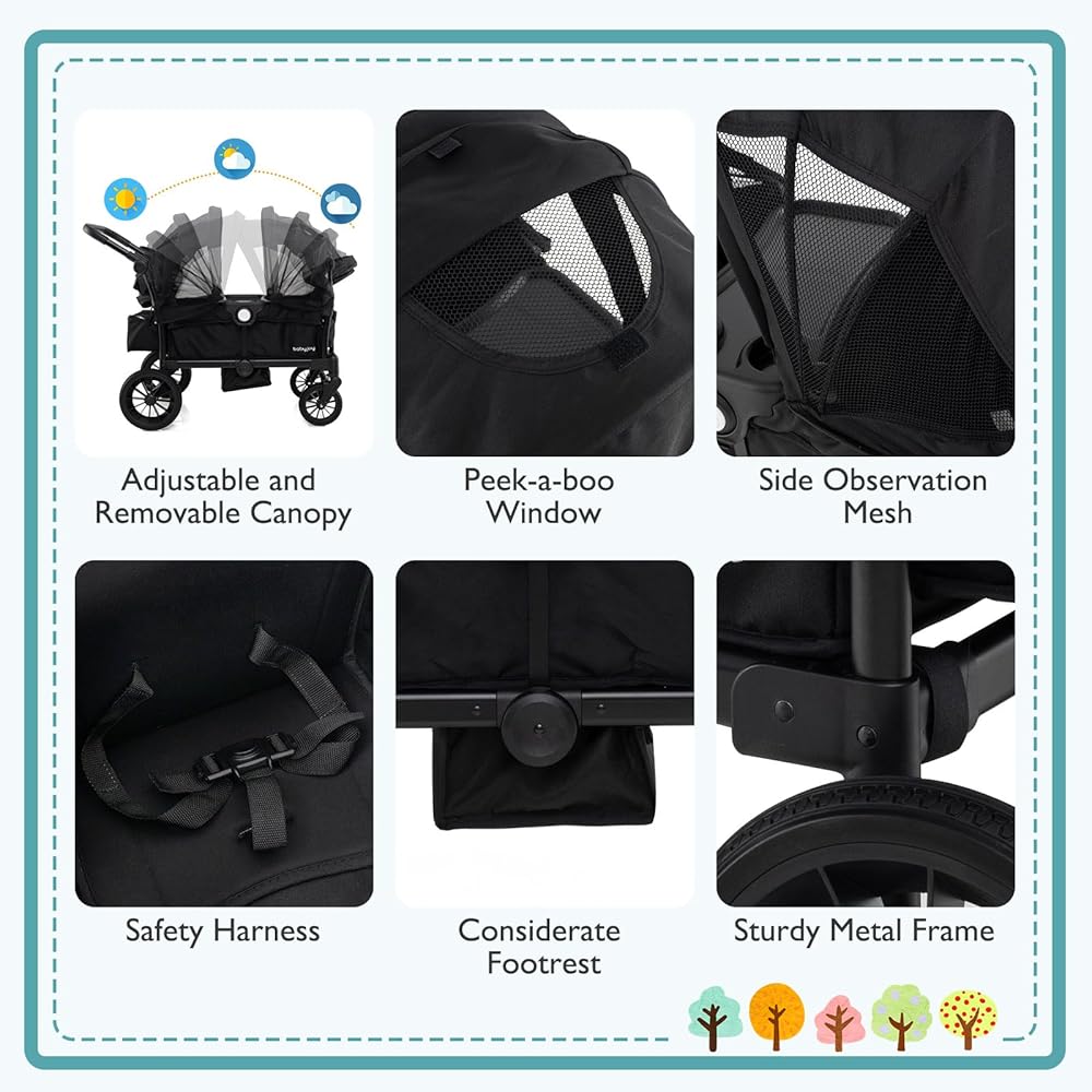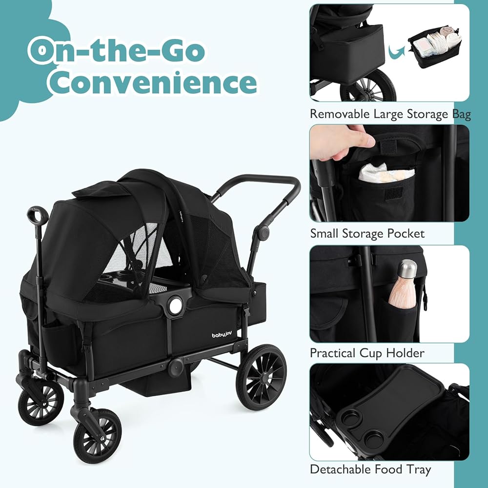 Enjoy On-the-Go Convenience: The wagon stroller comes with a cup holder, food tray, storage bag, and pocket for keeping essentials organized and accessible during outings. Additionally, the adjustable canopy provides sun protection for your kids while on the move.