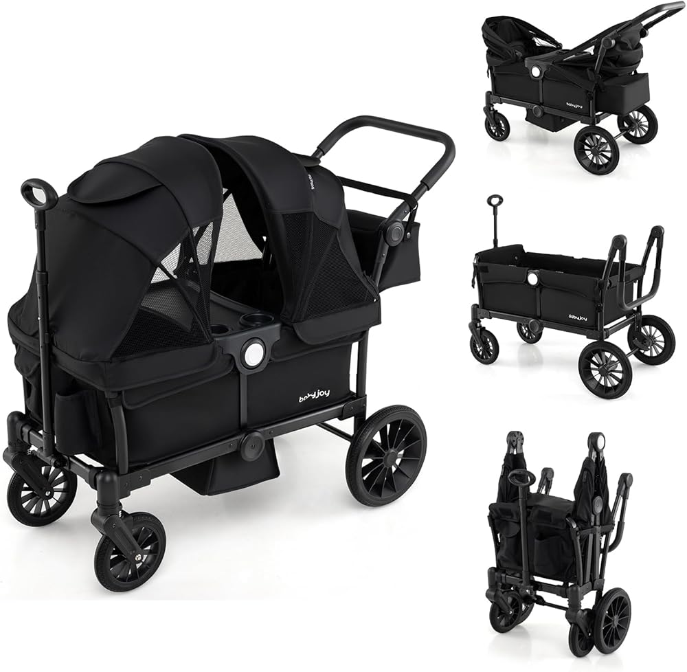 BABY JOY Wagon Stroller for 2 Kids, Collapsible Push Pull Double Stroller Wagon with Adjustable Handle Bar, Removable Canopy, Safety Harness, Cup Holder, Snack Tray & Storage Bag (Black)