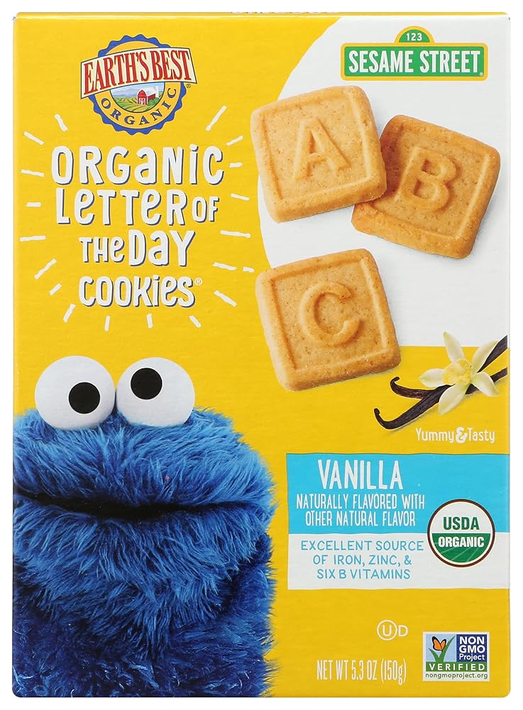 Earth's Best Organic Sesame Street Letter of the Day Cookies make snacking nutritious and fun as kids learn their ABCs with every great-tasting bite. They can be enjoyed out of the box or in individual single serving size bags– perfect for lunchboxes or on the go. Earth's Best is committed to fostering healthy habits for children by providing fun, convenient, foods with superior nutrition. Every item in the Earth's Best Sesame Street line is designed to meet toddler's special nutritional needs, as recommended by the nutritional and pediatric experts from the Earth's Best Medical Advisory Board. Containing an excellent source of iron, zinc, and six B vitamins, our delicious breakfasts, meals and snacks make healthy eating fun throughout the day. Earth's Best Sesame Street is part of Sesame Workshop's multifaceted Healthy Habits for Life initiative designed to start children off with healthier habits early on in life.