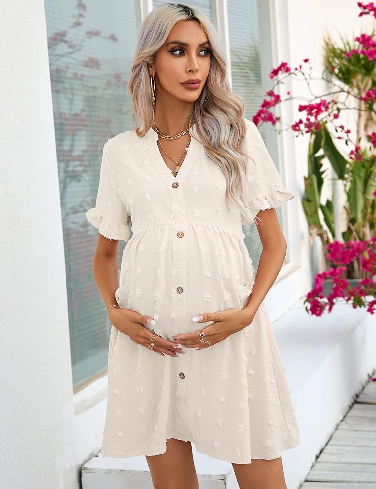 FEATURES: The maternity dress features v neck, swiss dot, ruffle sleeve, button down(decorated buttons front), solid color, loose, high waist, side pockets, babydoll dress, a-line, flowy, making the womens maternity summer dress elegant and flattering. Cute maternity dress is must-have items in your wardrobe.