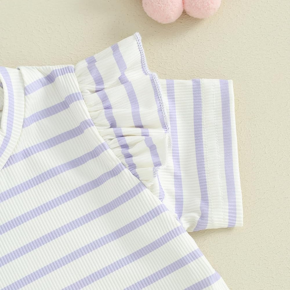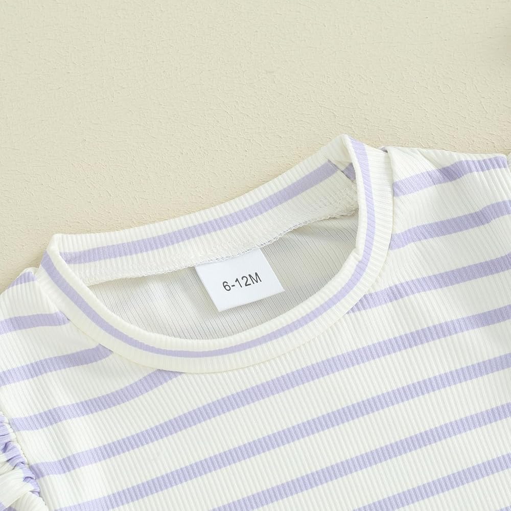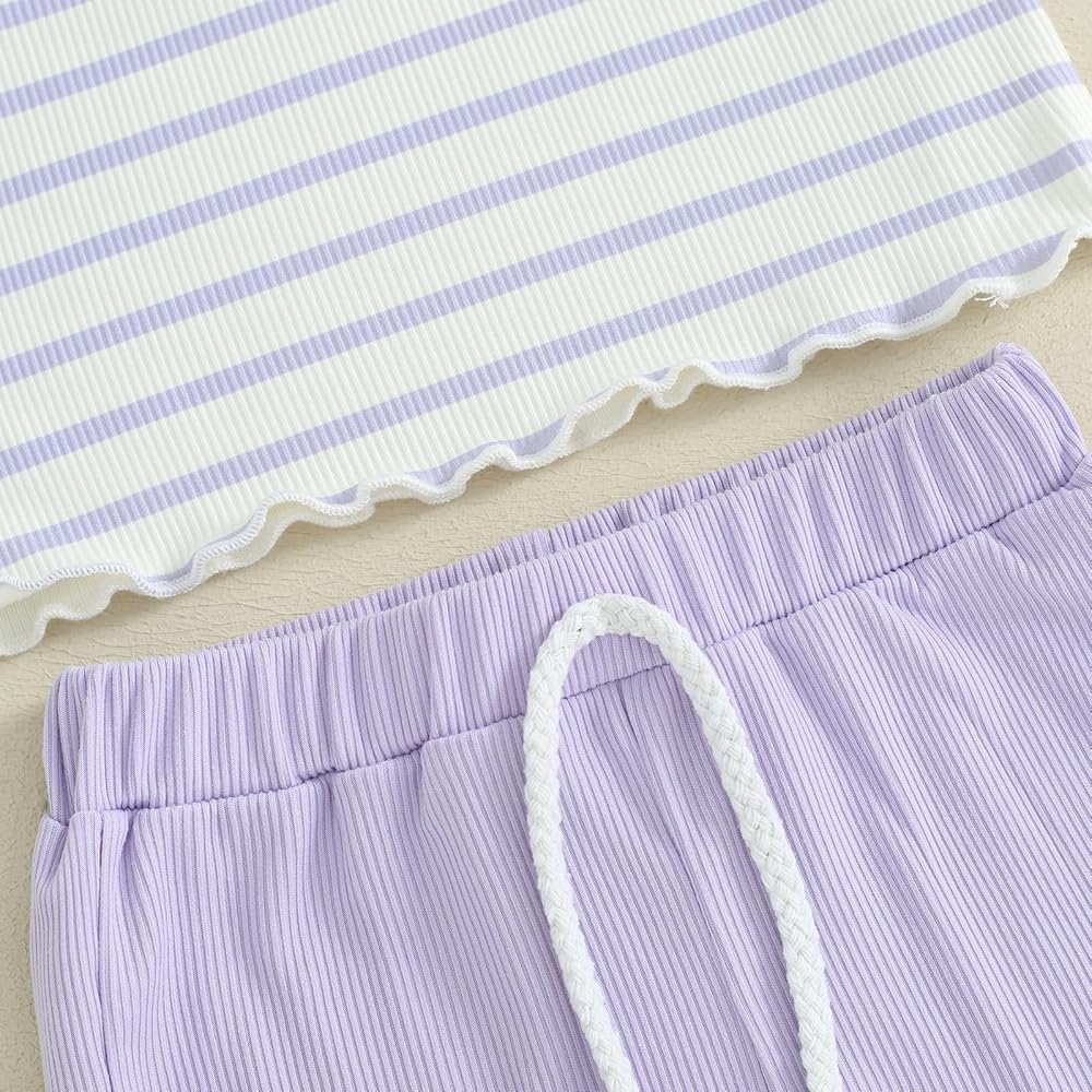 DESIGN: Spring baby girl clothes: Loose fit, striped print. Tops: Short sleeve, crew neck, ruffles. Shorts: Elastic waistband, decorative drawstrings, wide leg, sweet and chic style. Make your princess more adorable and eye-catching.