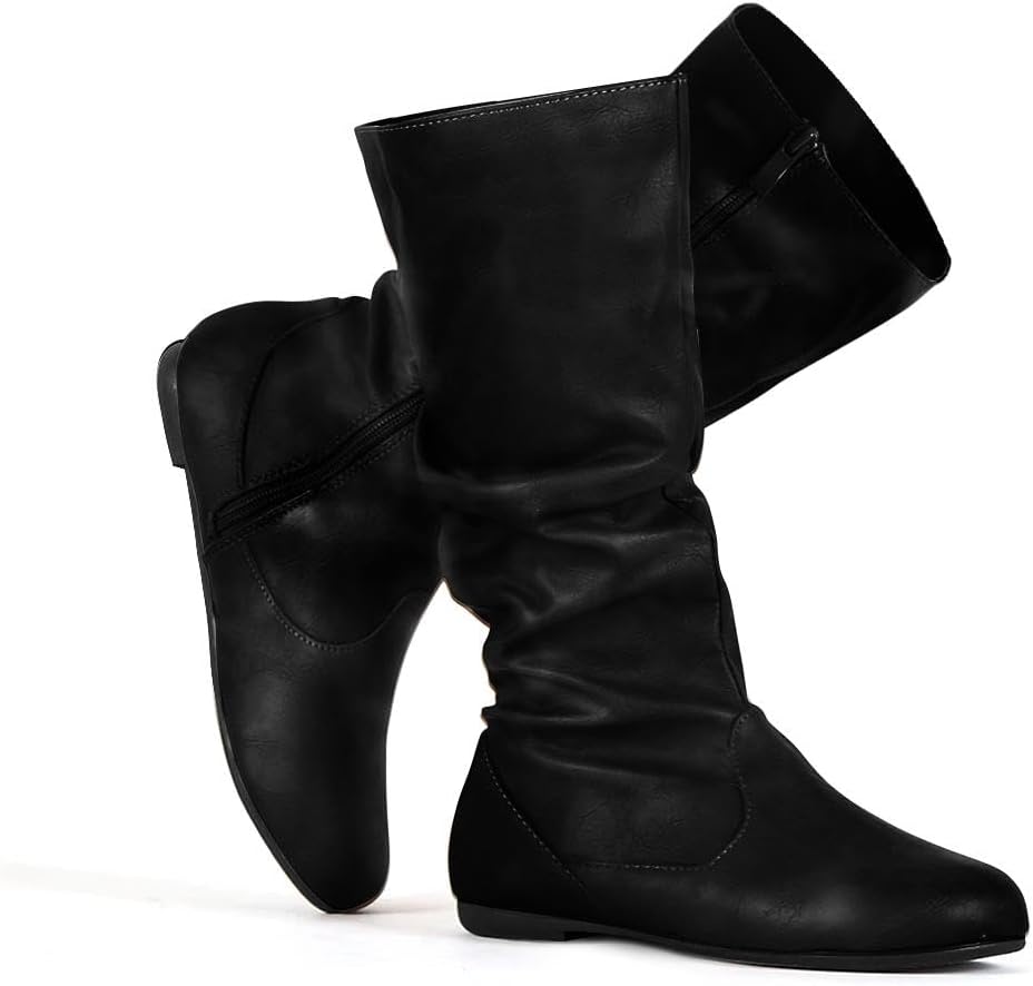 katliu Women's Slouchy Mid Calf Boots Zip up Flat Boots