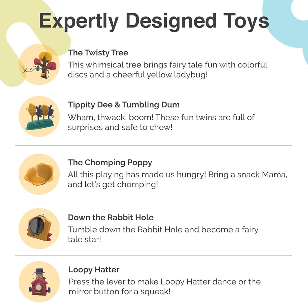 LEARNING TOYS! The PortaPlay Activity Center Wonderland features ample toys for your curiouser and curiouser little one. The toys are thoughtfully designed to entertain and develop fine motor skills and for cognitive development.