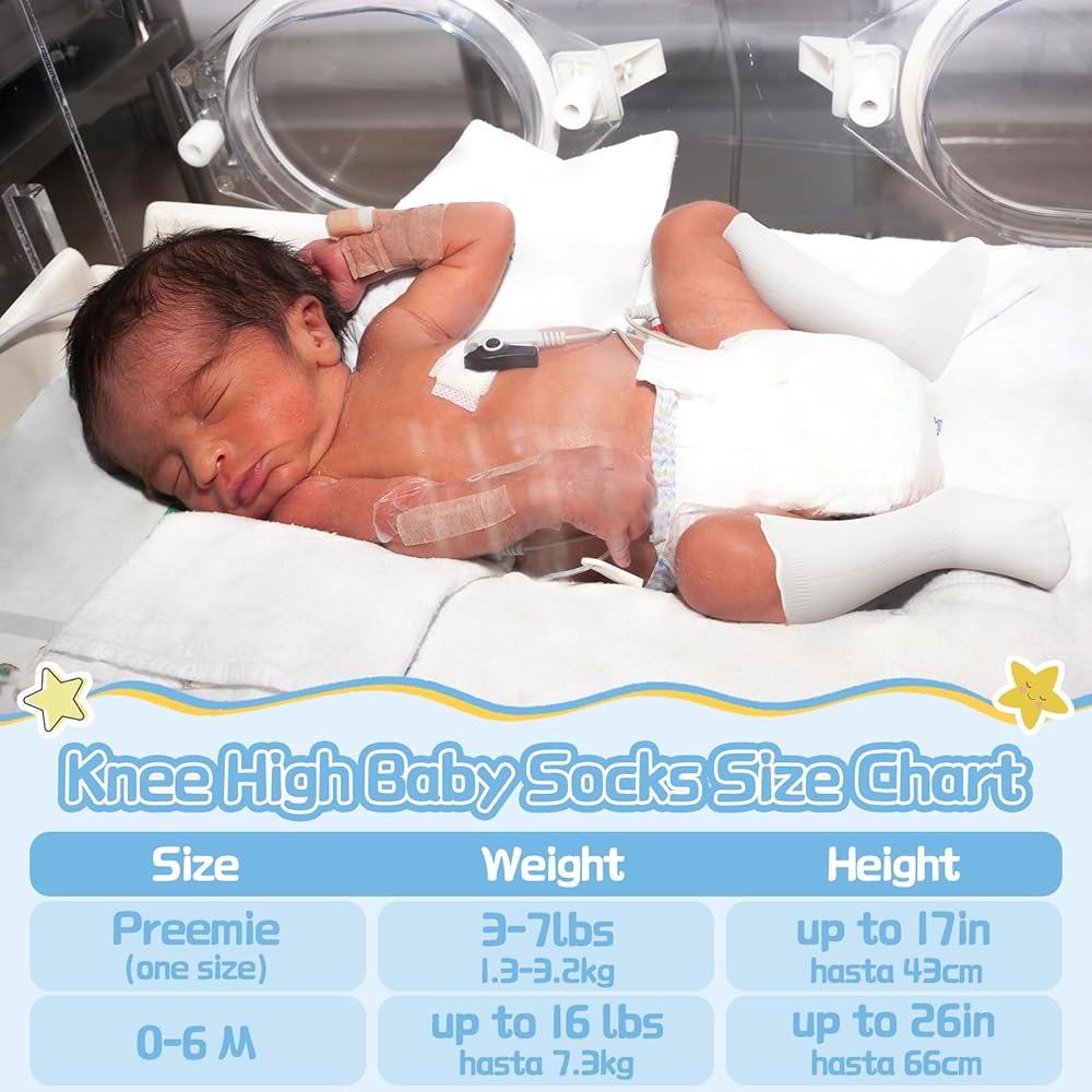 Knee Length: the long preemie stockings provide more protection for the legs of premature babies; The 2 size is suitable for preemie babies weighing 3-7 lbs and baby of 0-6 months respectively, specially designed for preemie sized feet; Designed for preemie or micro newborn baby