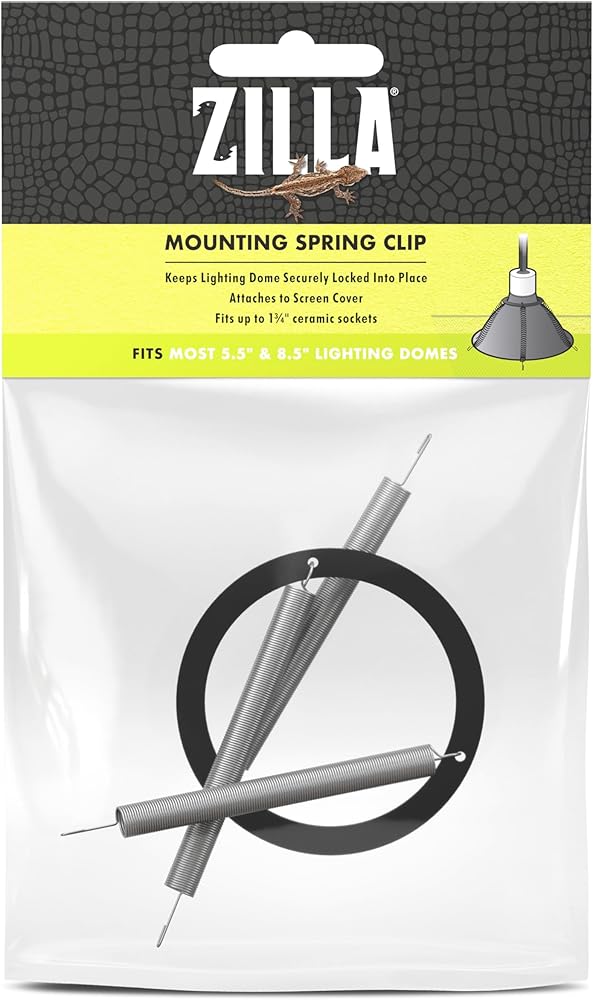 The Zilla Mounting Spring Clip keeps lighting domes securely locked into place. The clip fits most 5. 5" and 8. 5" domes and easily fits around the cord socket (up to 1-3/4") of the lighting dome. To attach, the clip firmly fastens to the screen cover with small metal hooks. It's discreet and the perfect solution!