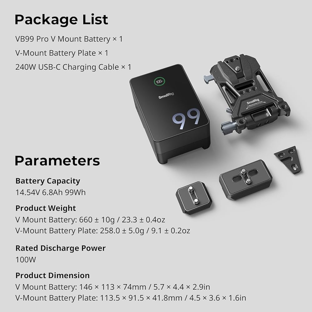 • Integrated Lightweight Power Solution: Combines the SmallRig VB99 Pro V-mount battery with a foldable V-mount plate 4064B, providing a compact, efficient design for creators who prioritize portability and space-saving setups.